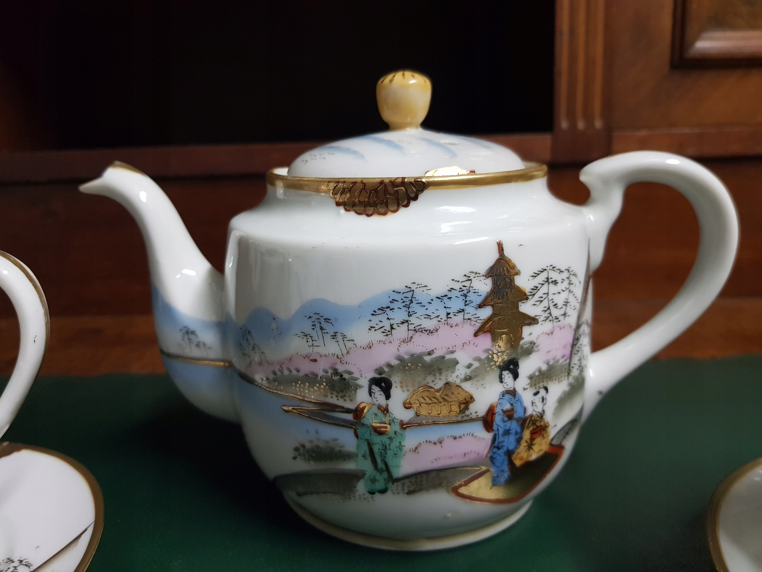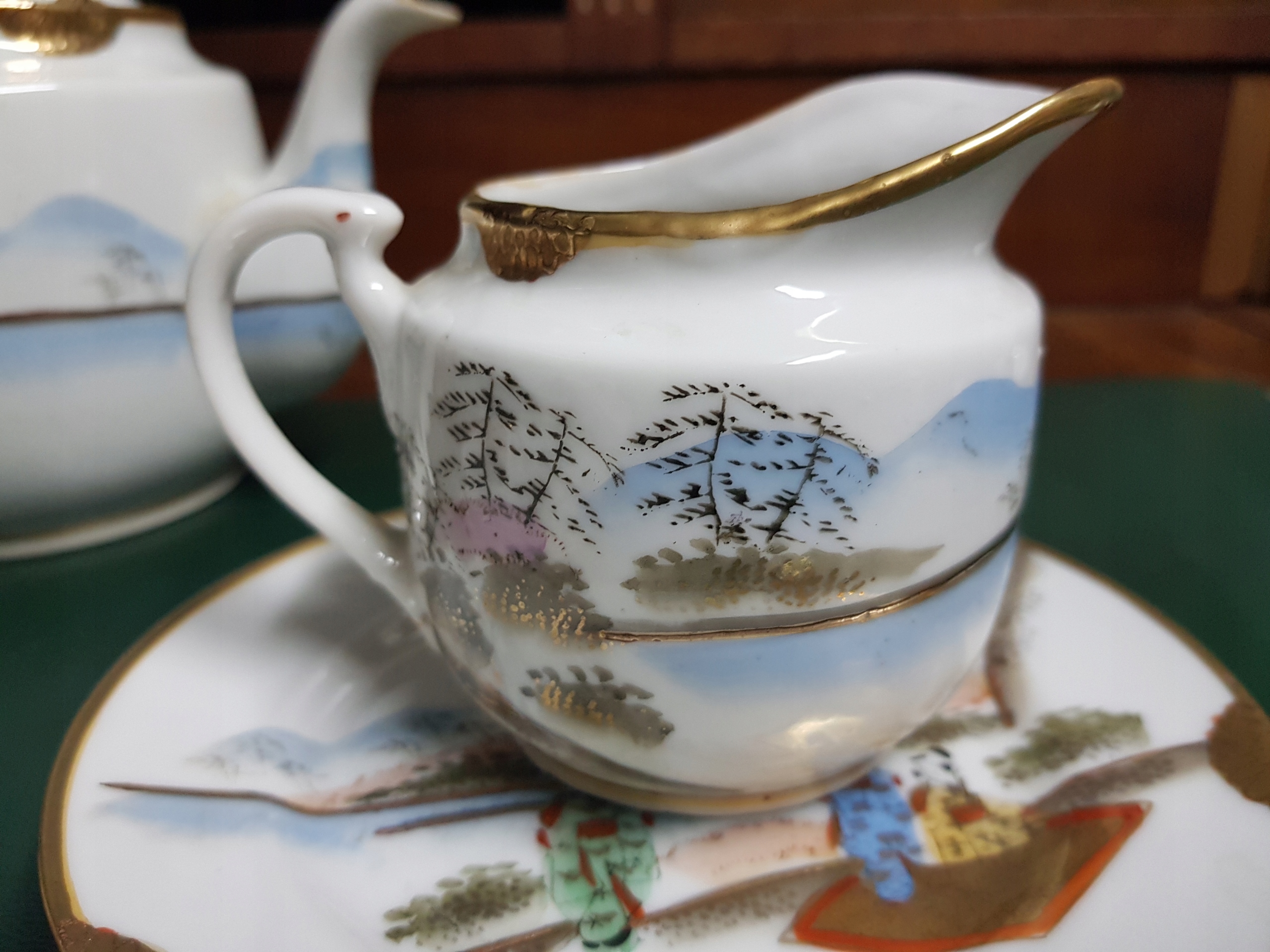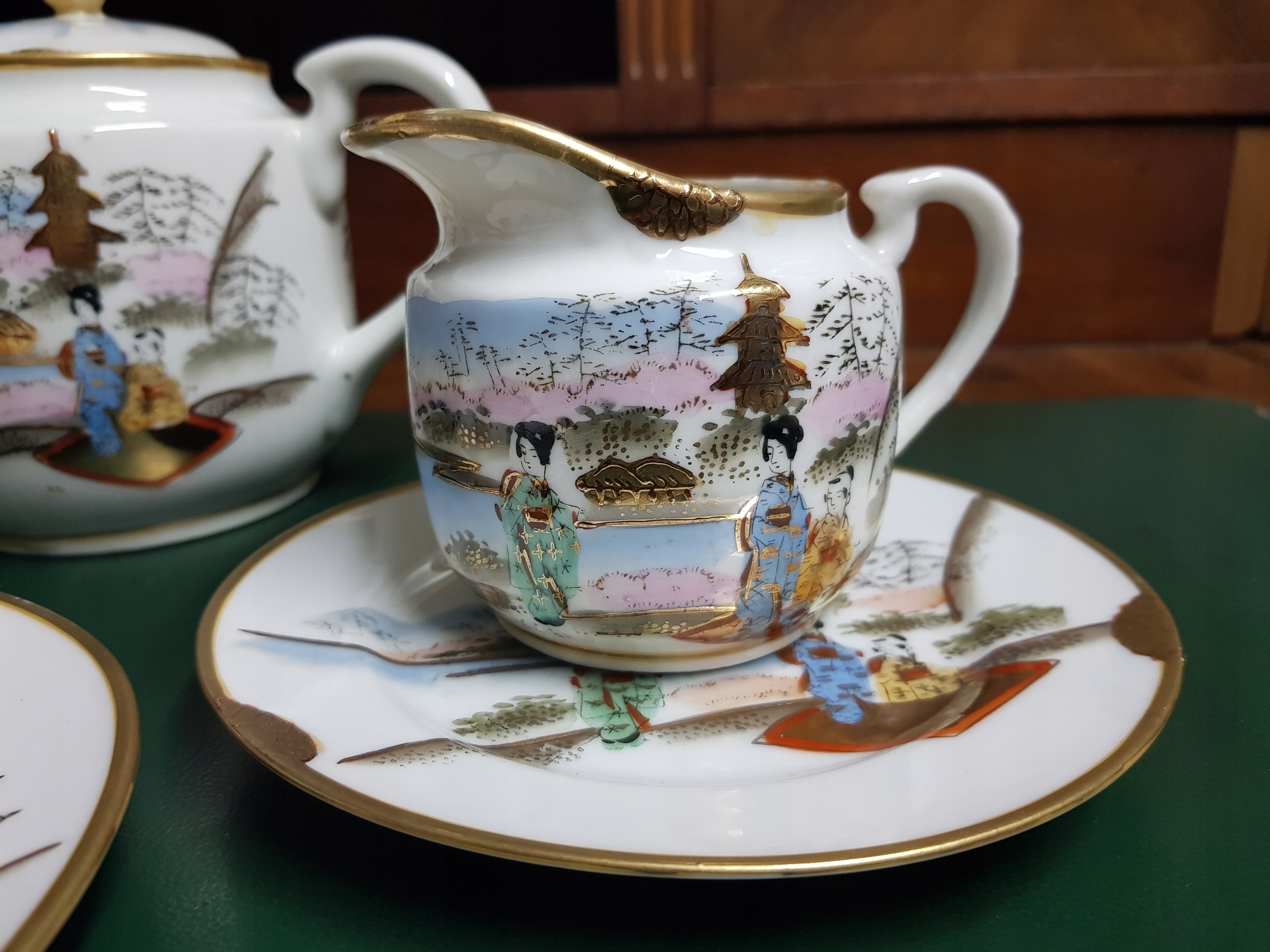 Предмет аукциона - декоративный набор, расписанный вручную гейшами Японии. В комплект входит кувшин, сахарница, молочник, 2 блюдца, 1 дизайнерская тарелка. Позолота ок. >