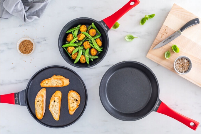 Сковороды Zwieger Obsidian из литого алюминия. Внутренняя часть посуды покрыта инновационным антипригарным антипригарным покрытием Greblon от WEILBURGER. Благодаря своим уникальным свойствам, повышающим устойчивость к царапинам, это покрытие используется в Классная посуда. Кроме того, термостойкий силиконовый лак, которым покрыта внешняя поверхность сковороды, позволяет ей надолго сохранять эстетичный вид. Более того, сковороды Zwieger прекрасно проводят и аккумулируют тепло.