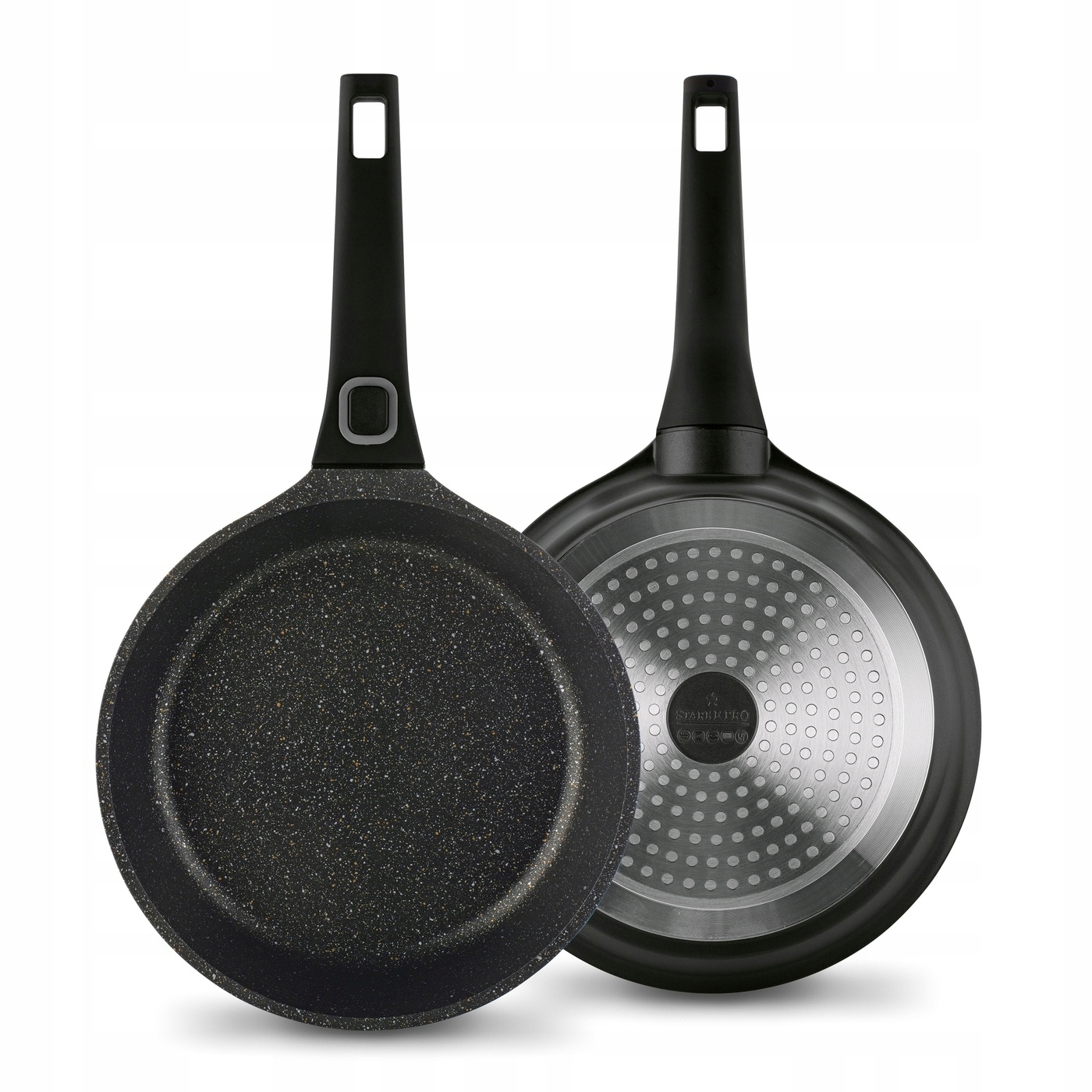 В комплект из 3-х сковород Starke Pro Svart Marble входит сковорода для блинов диаметром 28 см и 2 универсальные сковороды диаметром 20/24 см. Его можно использовать на индукционных, газовых, керамических и электрических плитах. Корпус сосудов отлит из сертифицированного алюминия. Благодаря этому они хорошо сбалансированы, тяжелы и имеют прочные стенки. Они также имеют гораздо более высокую устойчивость к высоким температурам и повреждениям. Используемое антипригарное каменное покрытие MARBLE PLUS обогащено и закалено. Оно также толще стандартных трехслойных покрытий, что предотвращает прилипание и пригорание ингредиентов. Его долговечность достигает 10 000 циклов истирания – один из лучших результатов в мире. На небольшом количестве сливочного или оливкового масла можно жарить все, что захотите (например, блины, мясо или овощи). Имеет маркировку PFOA Free, поэтому полностью безопасен для здоровья и окружающей среды. Экономию энергии обеспечивает индукционное дно, которое нагревается эффективно и равномерно. Все представленные сковороды можно удобно мыть. Эстетичный дизайн мраморного набора алюминиевых сковородок (для блинов и яичницы и 2 классических) от Svart со вкусом украсит вашу кухню – это простой и комфортный способ создания диетических и легкоусвояемых блюд. Представленные сковороды имеют ручки soft touch. Благодаря этому они не нагреваются и не скользят в руке. Кроме того, их ручки съемные. Это значит, что, сняв их, вы сможете поставить противни в духовку и запекать пищу даже при температуре 200 градусов Цельсия. Набор рекомендует Петр Кухарский, который лично проверил его возможности и поставил ему высокую оценку.