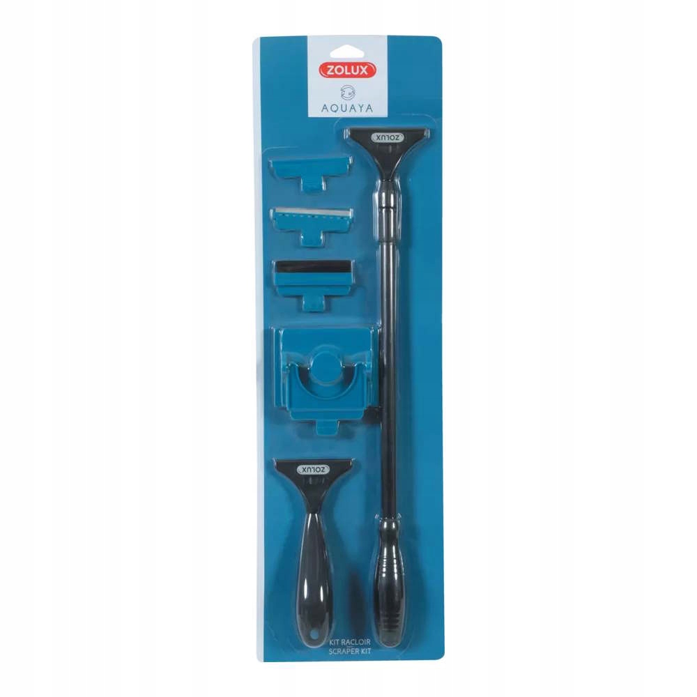 Набор для чистки аквариумных стекол состоит из телескопического скребка длиной 50-70 см, небольшого ручного скребка и трех различных насадок: губки, металла и пластика.