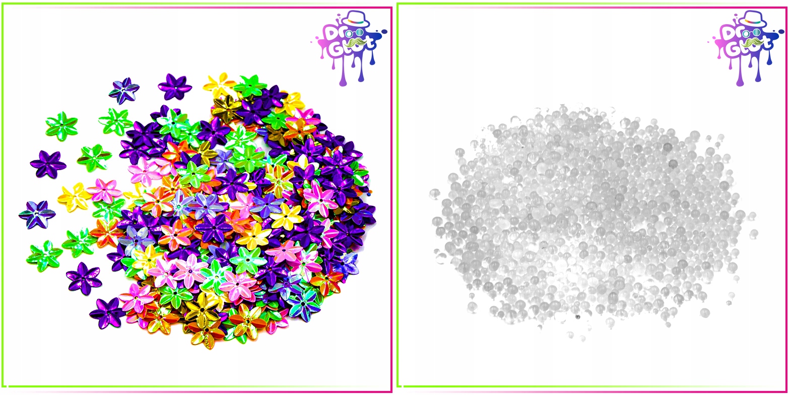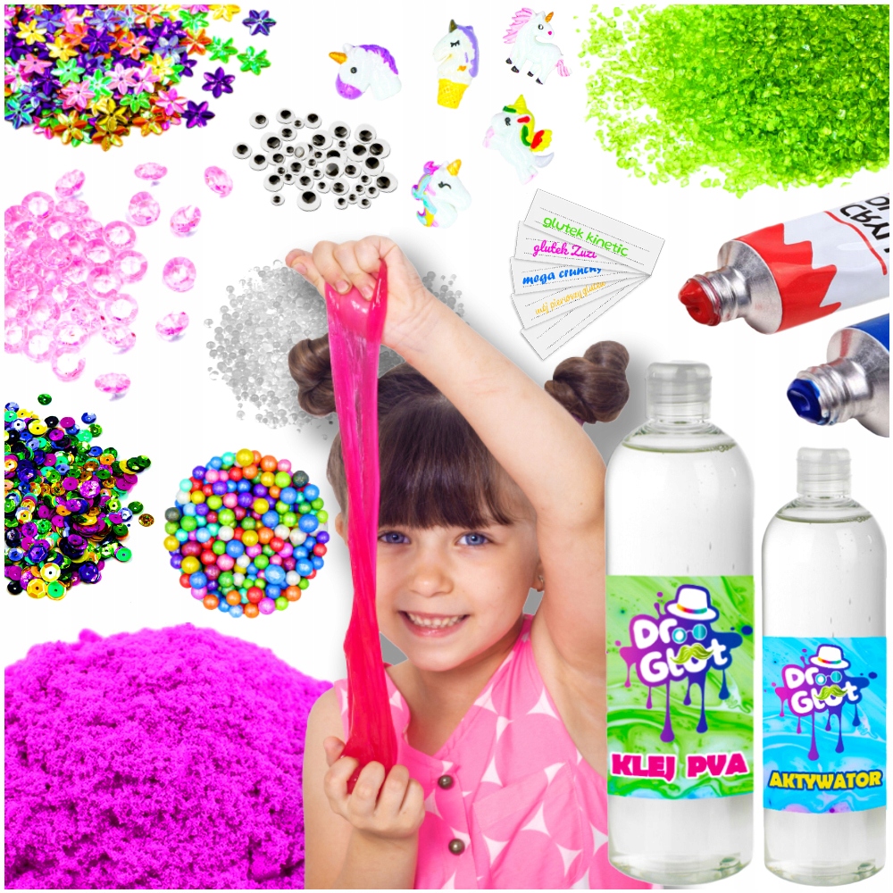 <р>1. Клей ПВА Dr Glut 500мл <р>2. Активатор 250 мл <р>3. Разноцветные шарики из пенопласта <р>4. Розовые бриллианты - 10 шт. <р>5. Зеленые декоративные камни <р>6. Цветы с блестками <р>7. Движение глаз <р>8. Разноцветные круглые пайетки <р>9. Красители акриловые - 2 шт по 12мл <р>10. Фигурки единорогов в лимитированном количестве - 5 шт <р>11. Розовый кинетический песок <р>12. 3D прозрачные шары <р>13. Инструкции по изготовлению простого клеяБЕСПЛАТНО стоимостью 5 злотых -