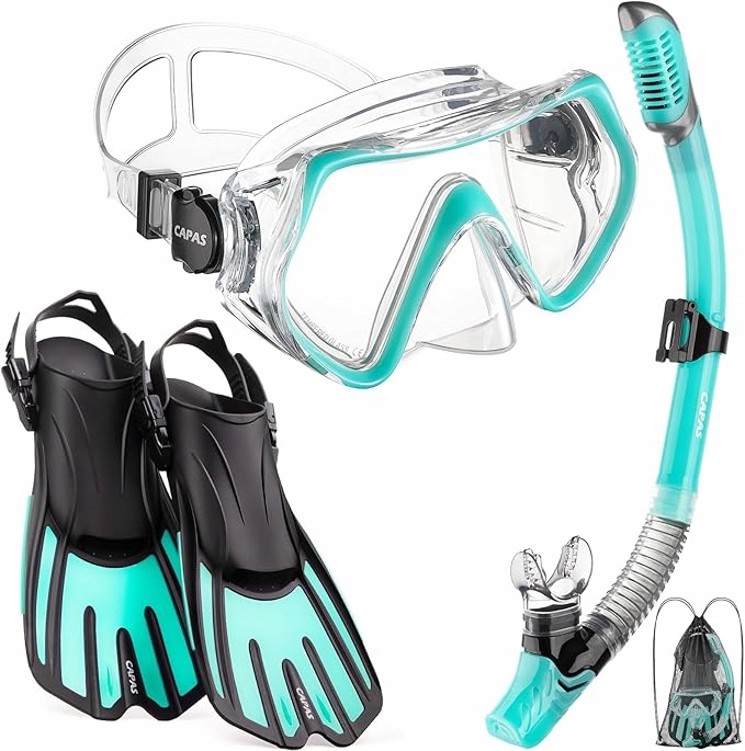 набор сноркелинга Capas с плавниками, туристическим оборудованием для взрослых, с короткими регулируемыми плавниками, высококачественной маской и сухой верхней трубкой, с изношенной сумкой - бирюзовый h2> roz. L/xl