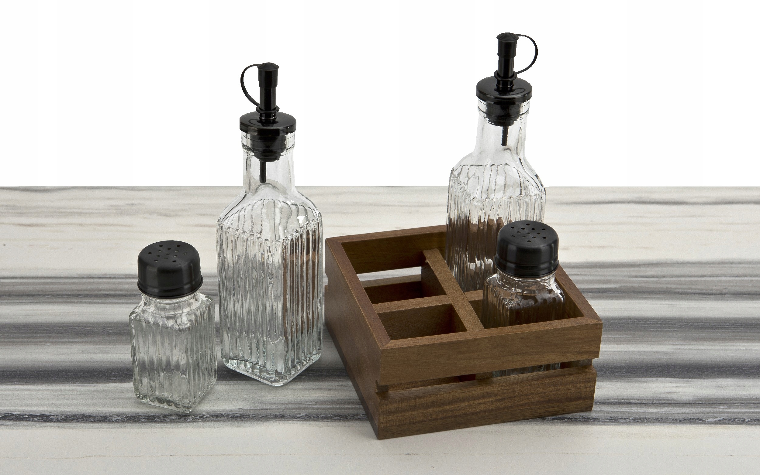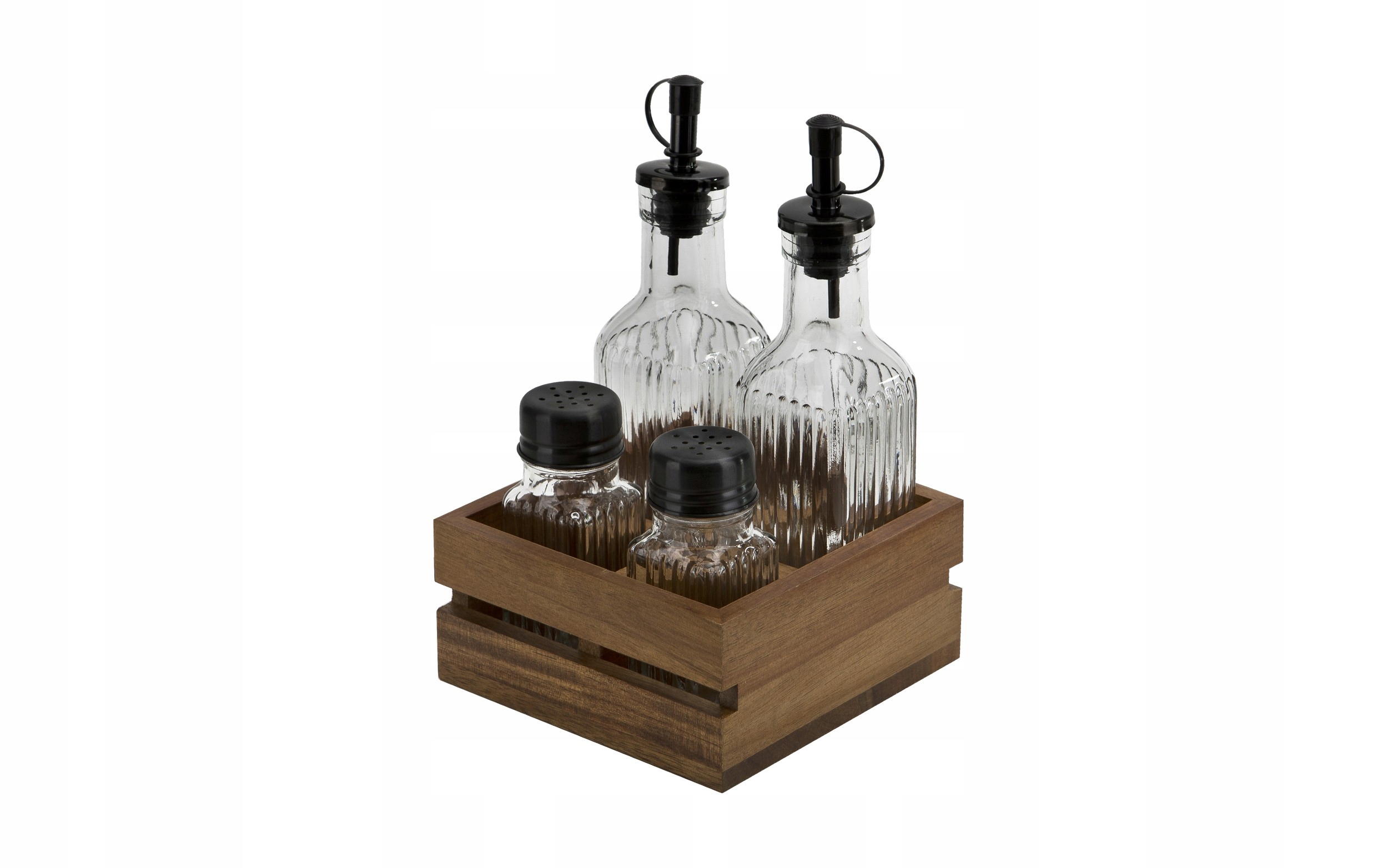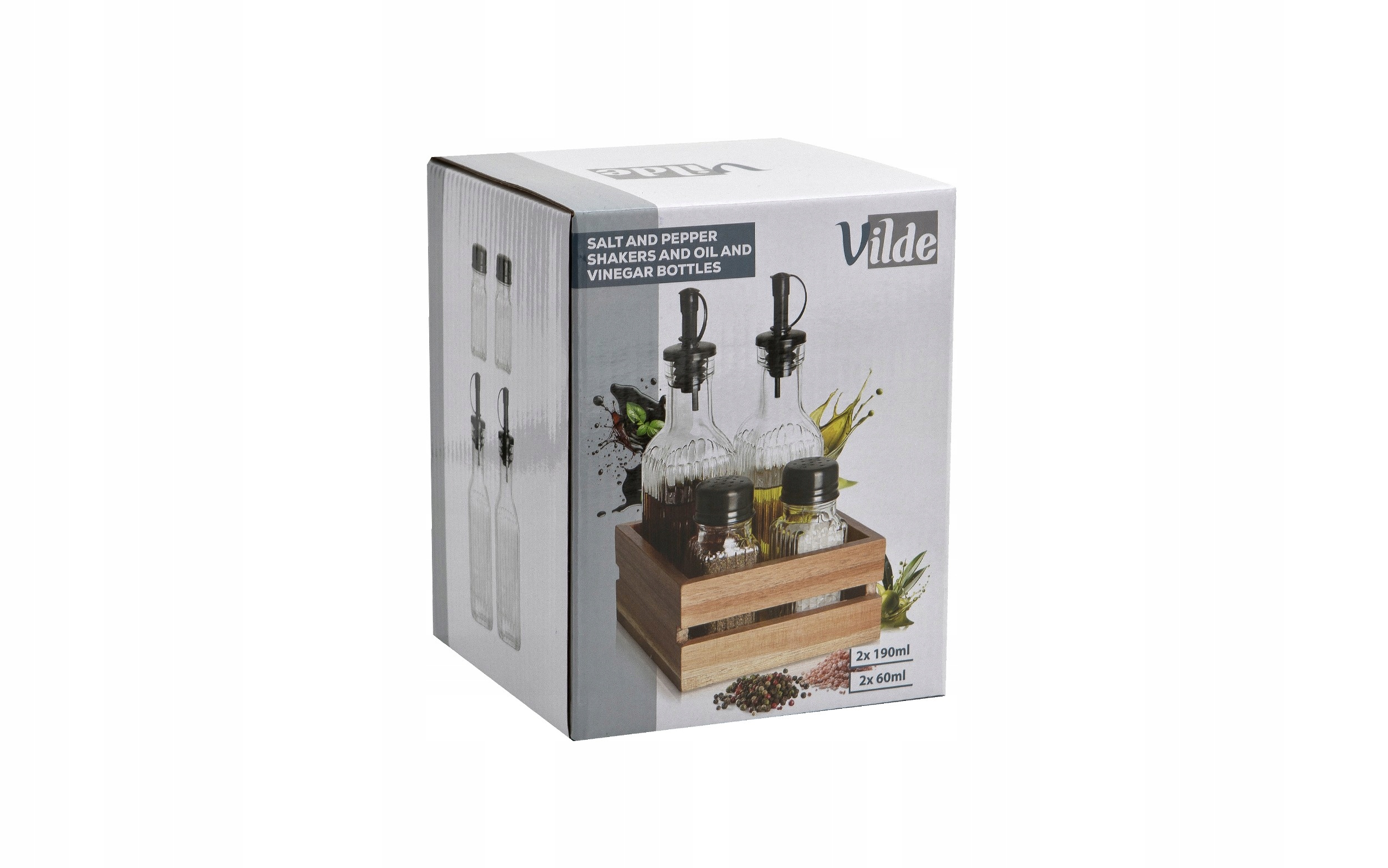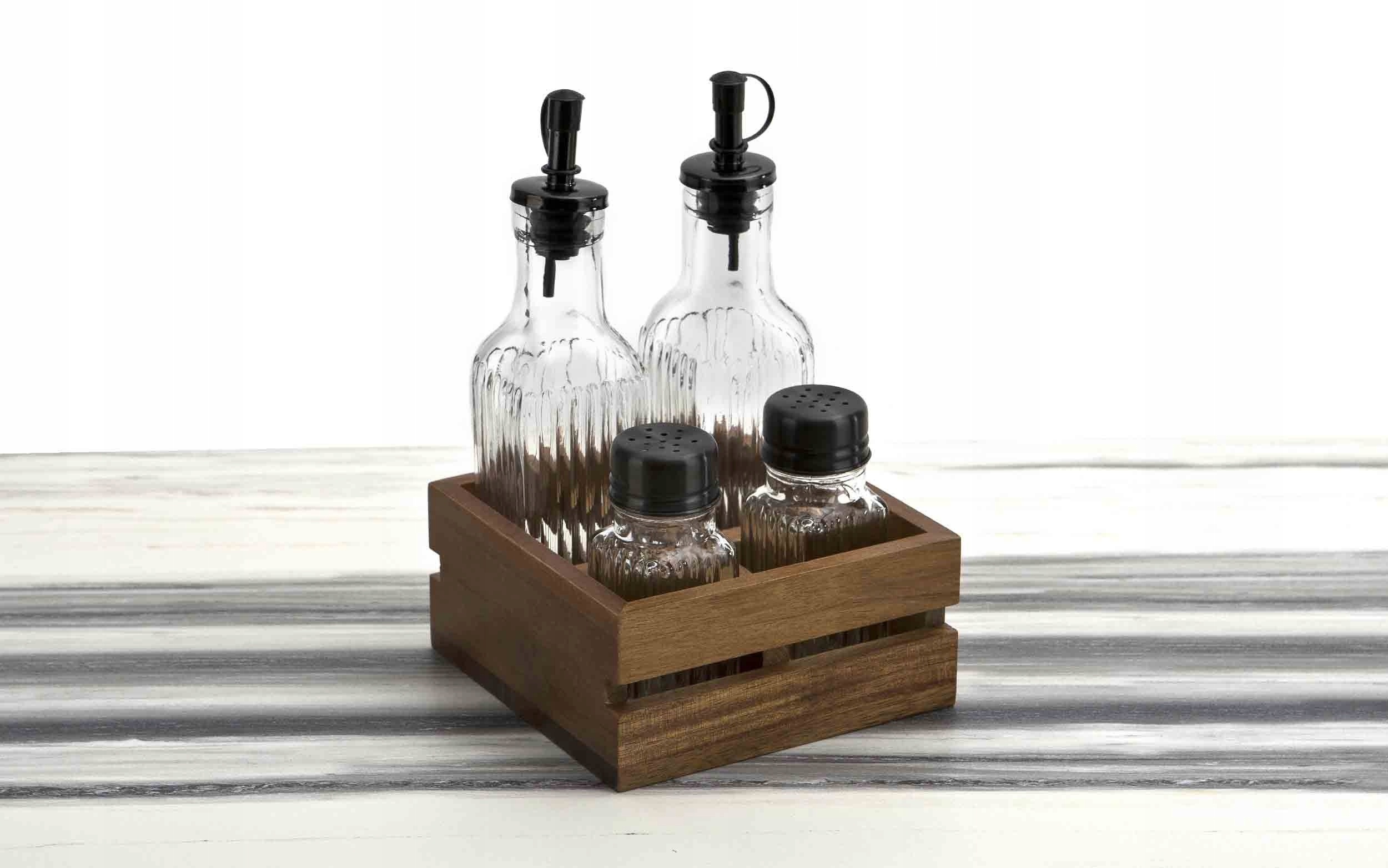 - Набор из 4 предметов: 2 бутылки оливкового масла/уксуса (190 мл) + 2 баночки для соли и перца для специй (60 мл).