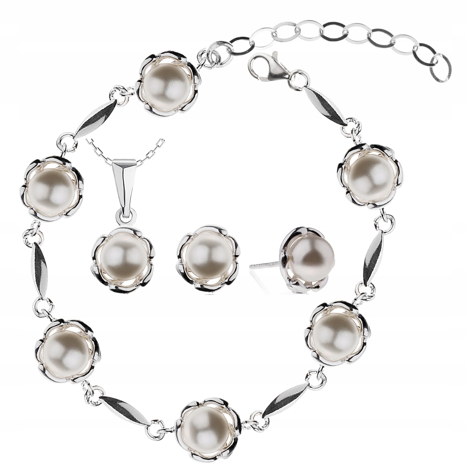 Предмет предложения - комплект элегантных серебряных украшений с белым жемчугом -