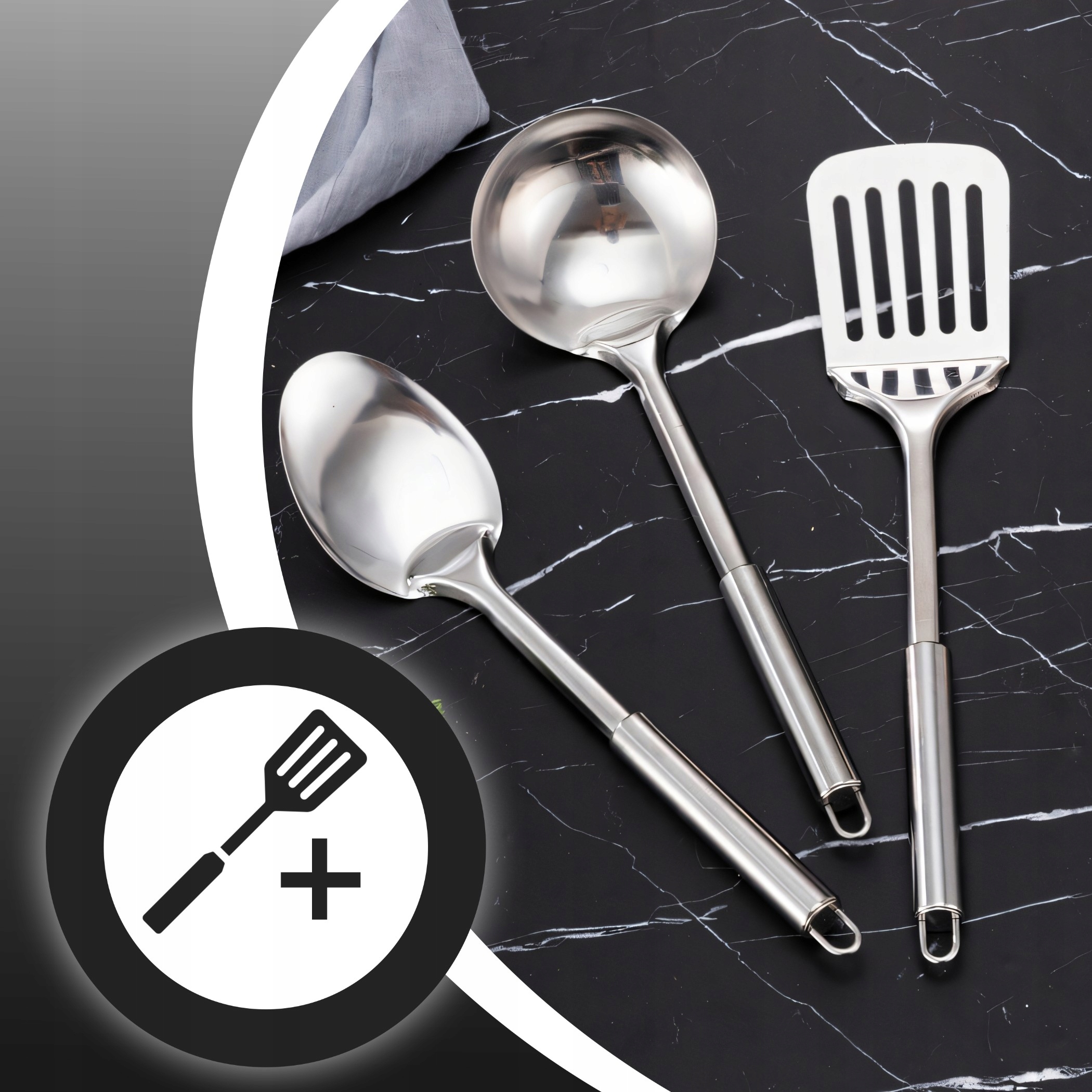 В комплект входят: суповая ложка, лопаточка и совочки, которые пригодятся в повседневной готовке.