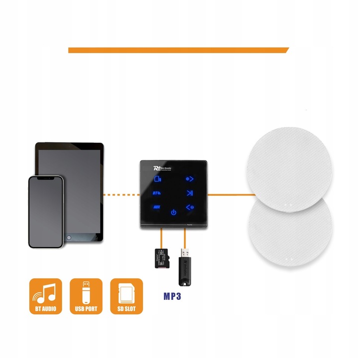 Ремонт или новое строительство? Тогда читайте дальше! Что может быть лучше, чем очень герметичная и красиво замаскированная звуковая система? С этим набором A50B все будет у вас под рукой. Никакого незакрепленного оборудования, никаких незакрепленных кабелей, только дизайнерская панель управления с сенсорным экраном и 2 потолочных динамика — это все, что вы видите. Однако вам не придется жертвовать простотой использования, опциями или качеством звука, поскольку в этом комплекте есть Bluetooth, MP3-плеер и две двухполосные колонки.