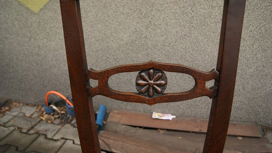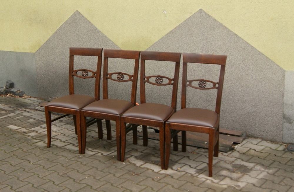 Предмет сегодняшнего аукциона — набор из четырех стульев межвоенного периода, изготовленных из массива дуба, недавно отремонтированных, полу -матовая отделка, новая обивка коричневого оттенка, сиденья на пружинах. Стулья готовы к непосредственной установке и использованию.