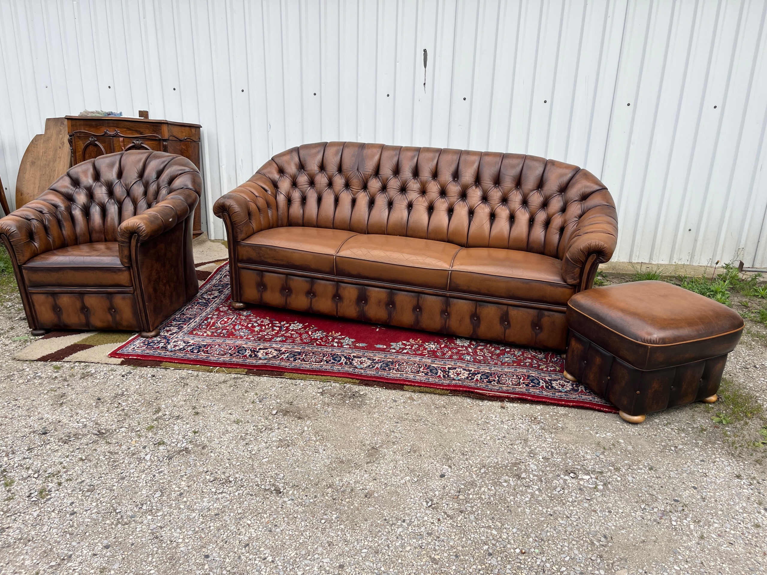 Set с кожей в стиле Честерфилда, состоящей из дивана, кресла и пуфа, привезенного из Германии, в оригинальном состоянии, коже в хорошем состоянии, но на среднем сиденье и одной зоне следов использования, видимых на картинках. Ширина доджера 205 см, стул 85, пуф 60 см.