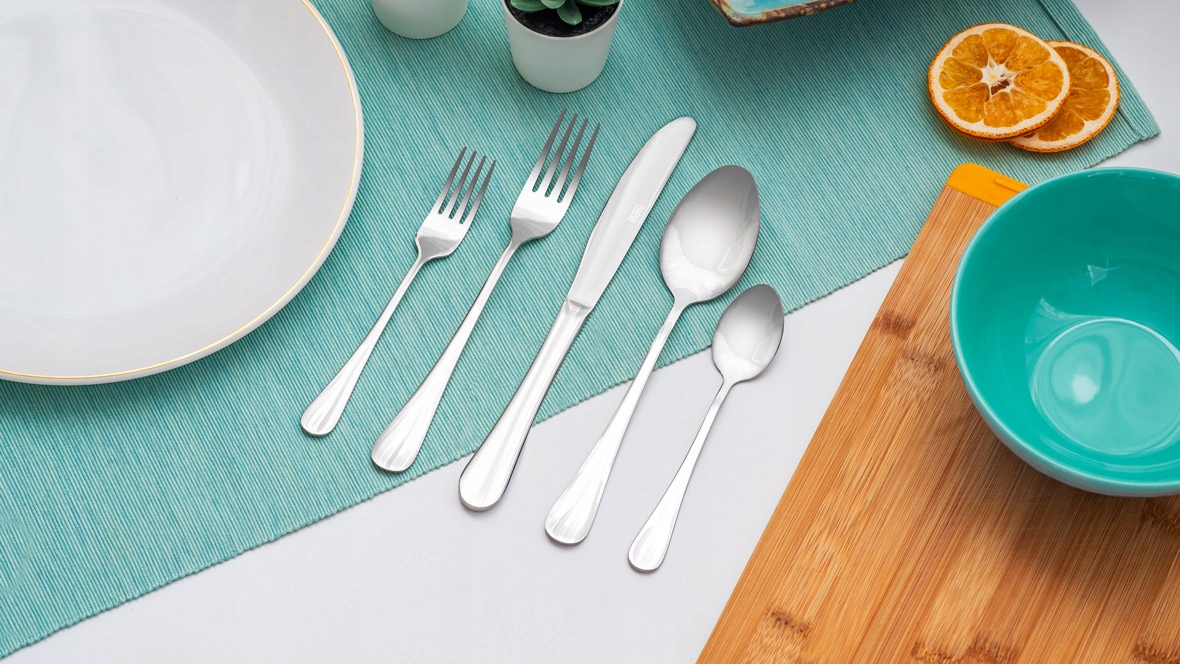 В набор входят столовые ложки, вилки, ножи, чайные ложки и вилки для торта. Утонченный дизайн, подчеркнутый закругленными краями, позволяет столовым приборам идеально сочетаться с любой посудой. Высокий комфорт использования обеспечивается не только идеальным балансом каждого элемента, но также добротным качеством изготовления и простотой очистки.