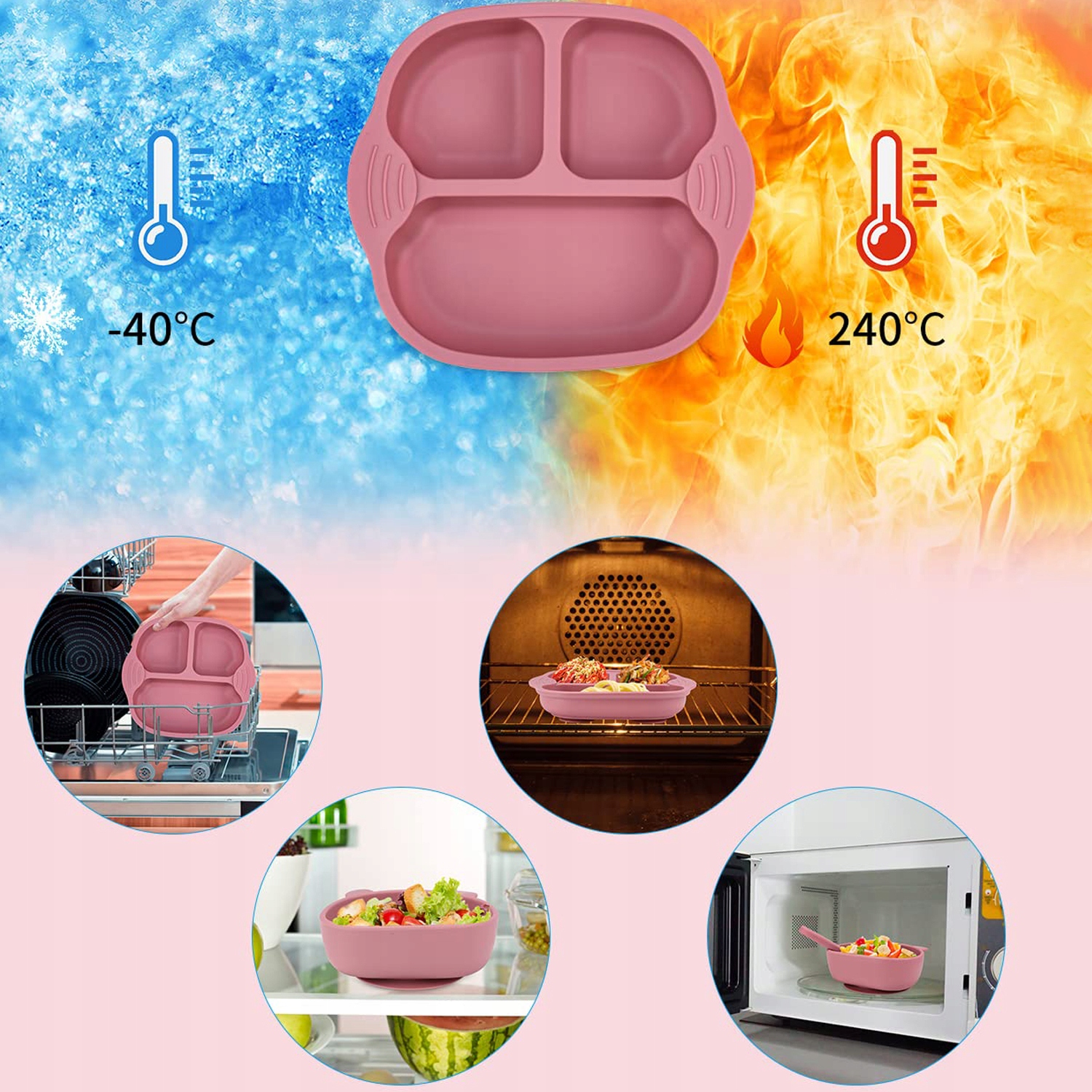 - Столовая посуда для детей подходит для температуры -40 ℃ -240 ℃, ее можно промыть в посудомоечной машине, холодильнике, духовке и микроволновой печи