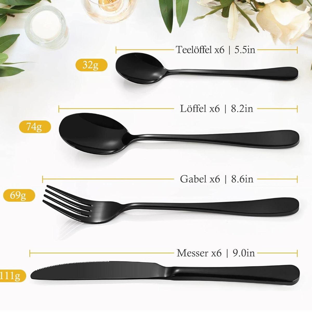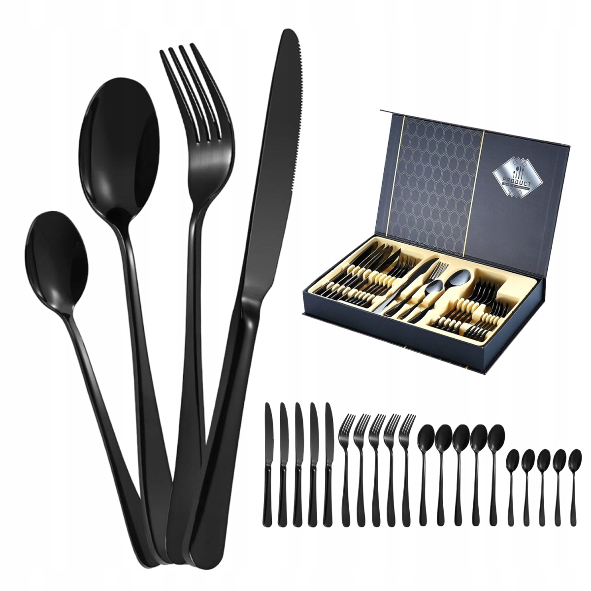 🧩 Набор столовых приборов из 24 предметов на 6 персон В набор золотых столовых приборов из 24 предметов входят 6 ножей, 6 ложек, 6 столовых ложек и 6 ложки, что делает его идеальным для любого дома.🧩