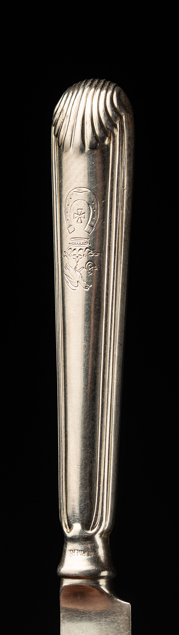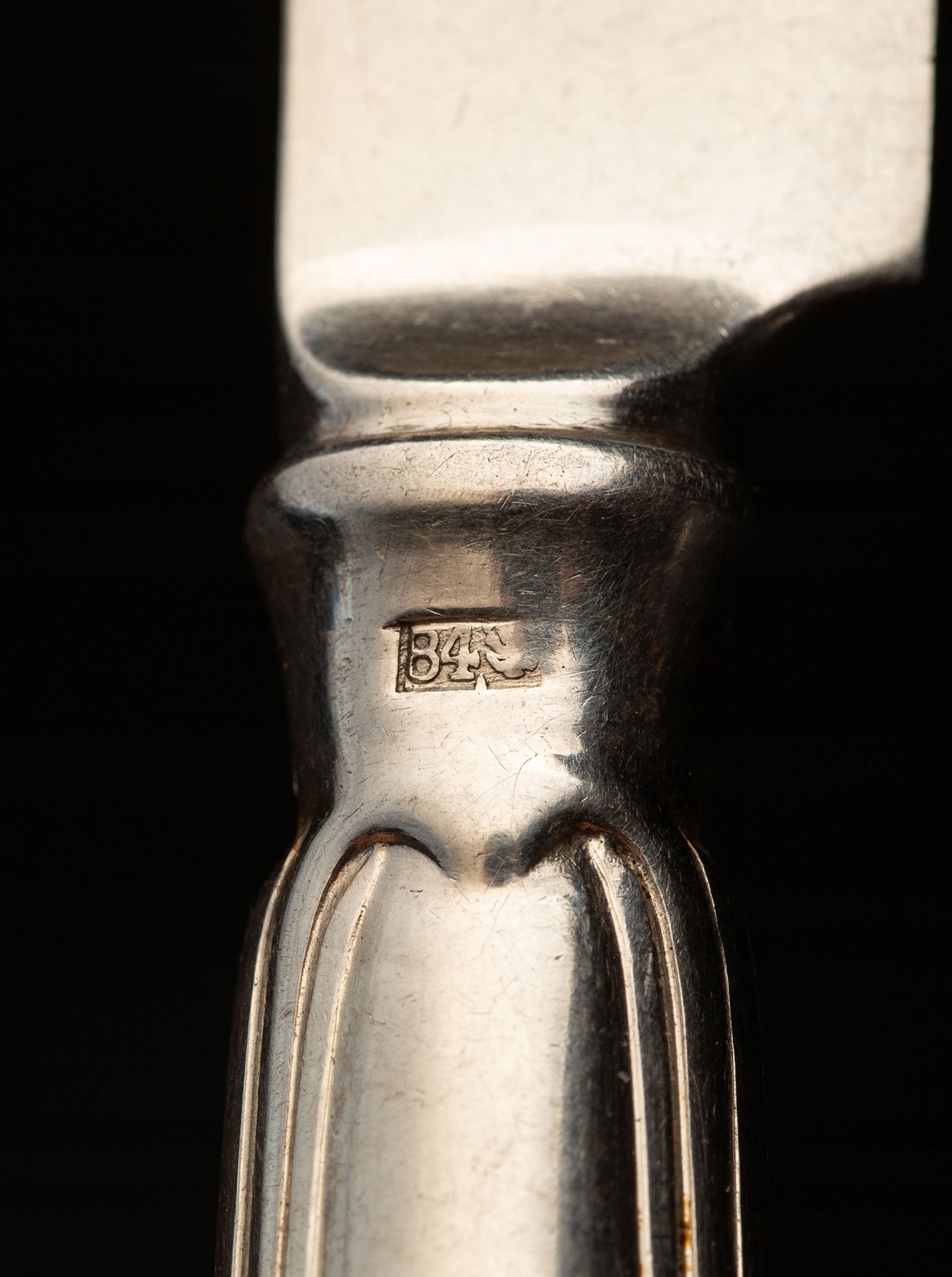 - 6 закусочных ножей (в комплекте из серебра). - и древко, и лезвие выполнены из серебра),