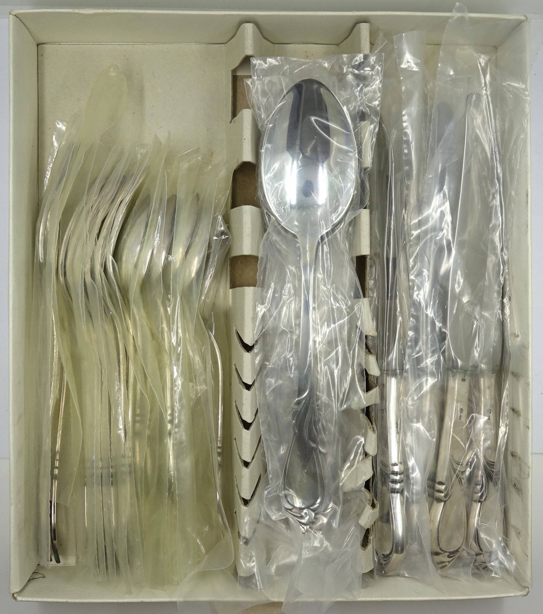 Описание: универсальное серебро, неиспользованное состояние, патина, все столовые приборы в фольгированной оболочке, проба: Ag 800, общий вес набора: около 1310 г; серебряные столовые приборы HEFRA, коллекция Rapsodia, набор состоит из 6 вилок, 6 ложек, 6 ножей и 6 чайных ложек, дополнительно включены 2 металлические вилки; набор помещен в оригинальную коробку.