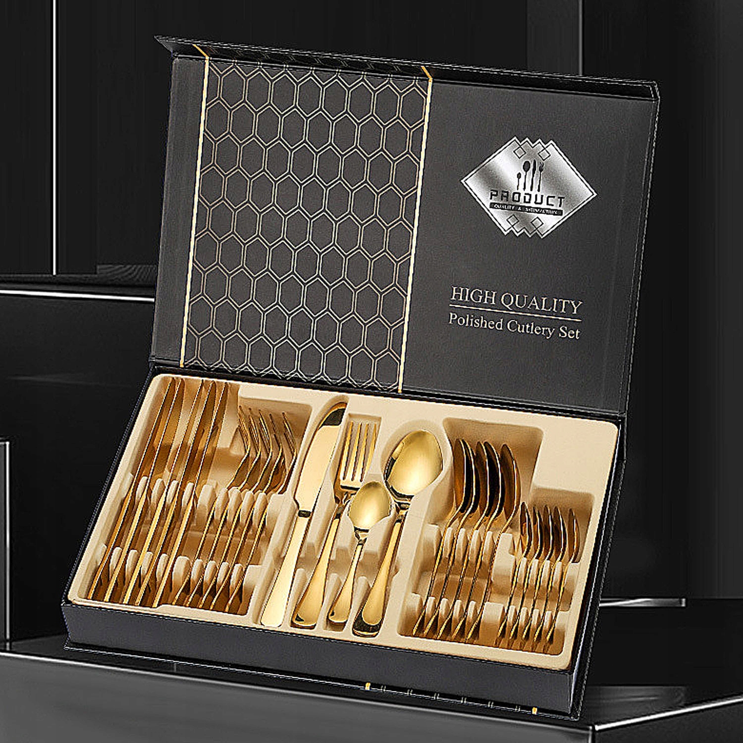 НАБОР СТОЛОВЫХ ПРИБОРОВ НАБОР ЧЕМОДАН ЗОЛОТО 24 СТОЛОВЫЕ ПРИБОРЫ НА 6 ПЕРСОН ВЫСОКОГО КЛАССА