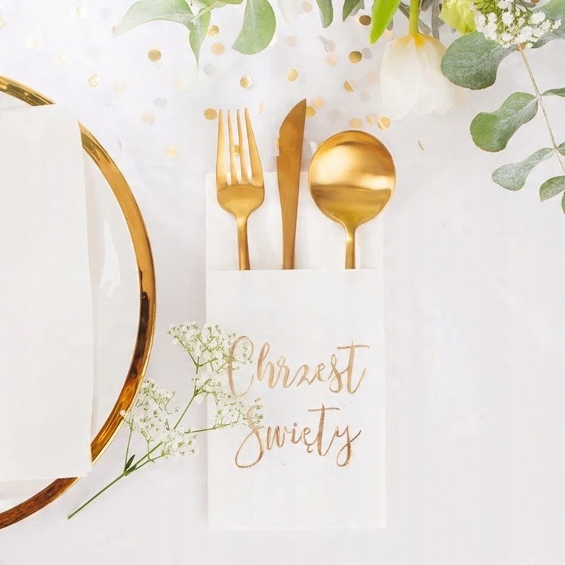 Красивый набор готовых украшений для стола, который можно использовать на Святое Крещение мальчика или девочки. Выбирайте готовый вариант с красивыми салфетками, карманами для столовых приборов и флизелиновыми дорожками с графическим мотивом белых роз на золотых ножках.