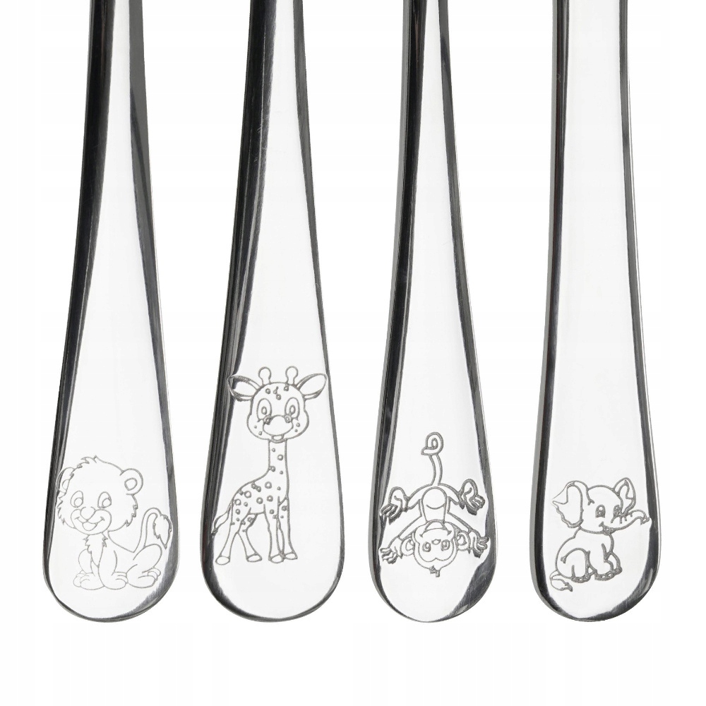 Набор состоит из вилки, ножа, большой и маленькой ложки с милыми животными мотивами.