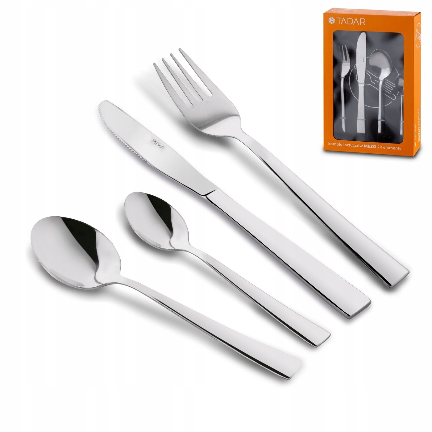 Набор столовых приборов Tadar Mezo 24 (вилки, ложки, ножи, чайные ложки) позволяют подавать блюда в элегантной рамке Полем Благодаря долговечности из нержавеющей стали, вы будете наслаждаться ими в течение долгого времени. Вы можете использовать этот набор в качестве подарка. Стройная форма позволяет вам удобно наслаждаться едой. Серебряная, блестящая отделка будет хорошо подходит для любого стиля посуды. Просто на 6 человек. Вы будете мотировать их в мгновение ока, также с помощью домашней посудомоечной машины. Вы будете есть все комфортно с этими столовыми приборами - от супа, до второго блюда, до вкусного десерта (торт, мороженое или фрукты с желе и взбитые сливки). b> 6 чайных ложек, -6 столовые ложки, -6 вилки, -6 ножей