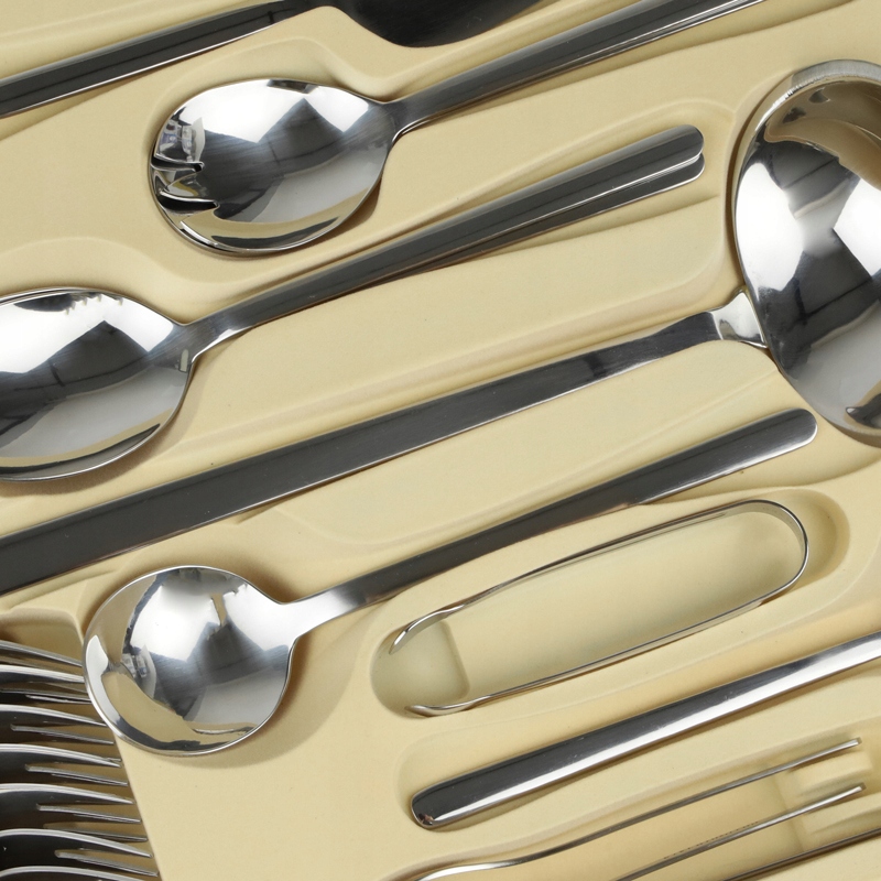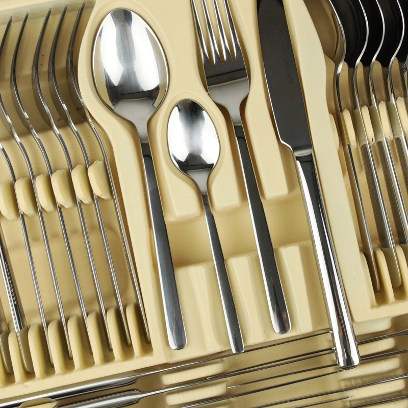 Набор столовых приборов из 72 предметов, изготовленный из высококачественнойнержавеющей стали. Набор столовых приборов на 12 персон сделает ваш стол необычайно стильным и элегантным. Все упаковано в элегантный чемодан из экологической кожи, который защищает столовые приборы от внешних факторов окружающей среды, что значительно облегчает хранение и транспортировку всех элементов набора.