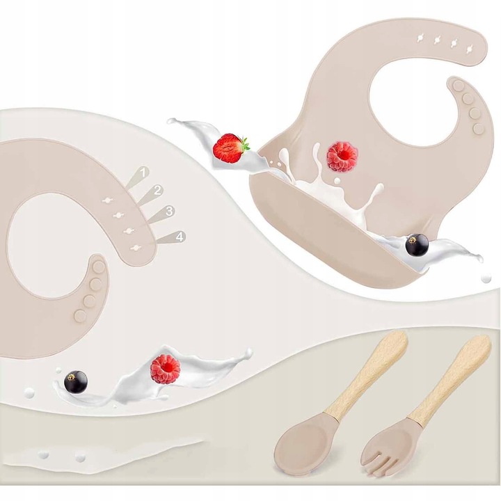 - Силиконовый нагрудник с возможностью регулировки пуговицами и большим подносом для распахивания пищи, выпадающей из устья ребенка, предотвращая падение на пол и одежду.