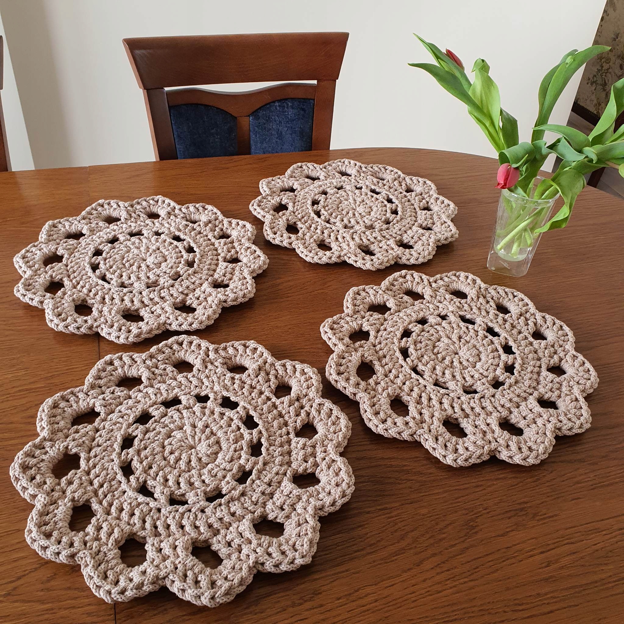 Набор салфеток - 4 штуки диаметром 35 см, изготовлены крючком из польской хлопчатобумажной нити толщиной 5 мм.