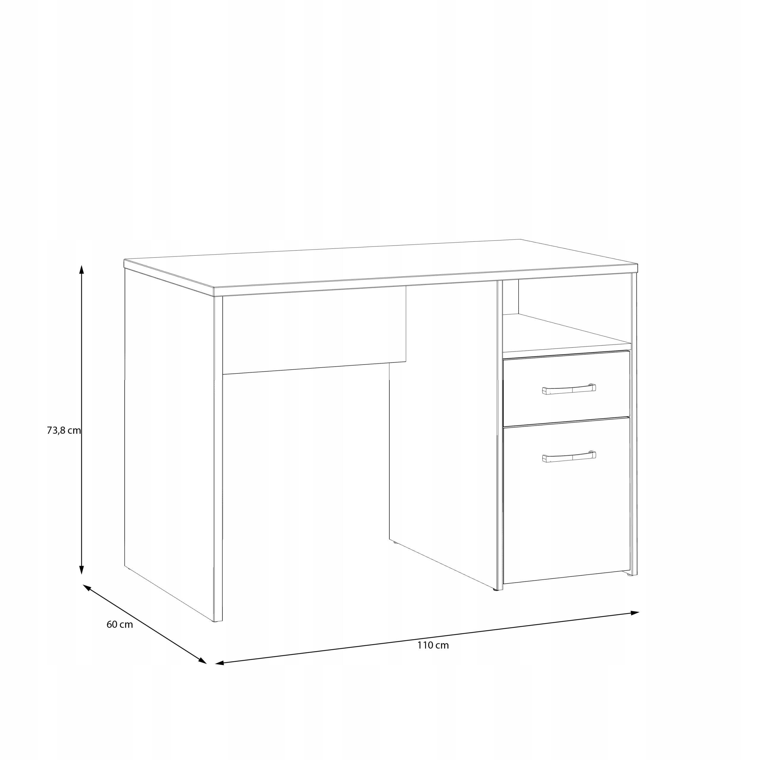 - Письменный стол с ящиком и тумбой: 110 х 73,8 х 60 см.