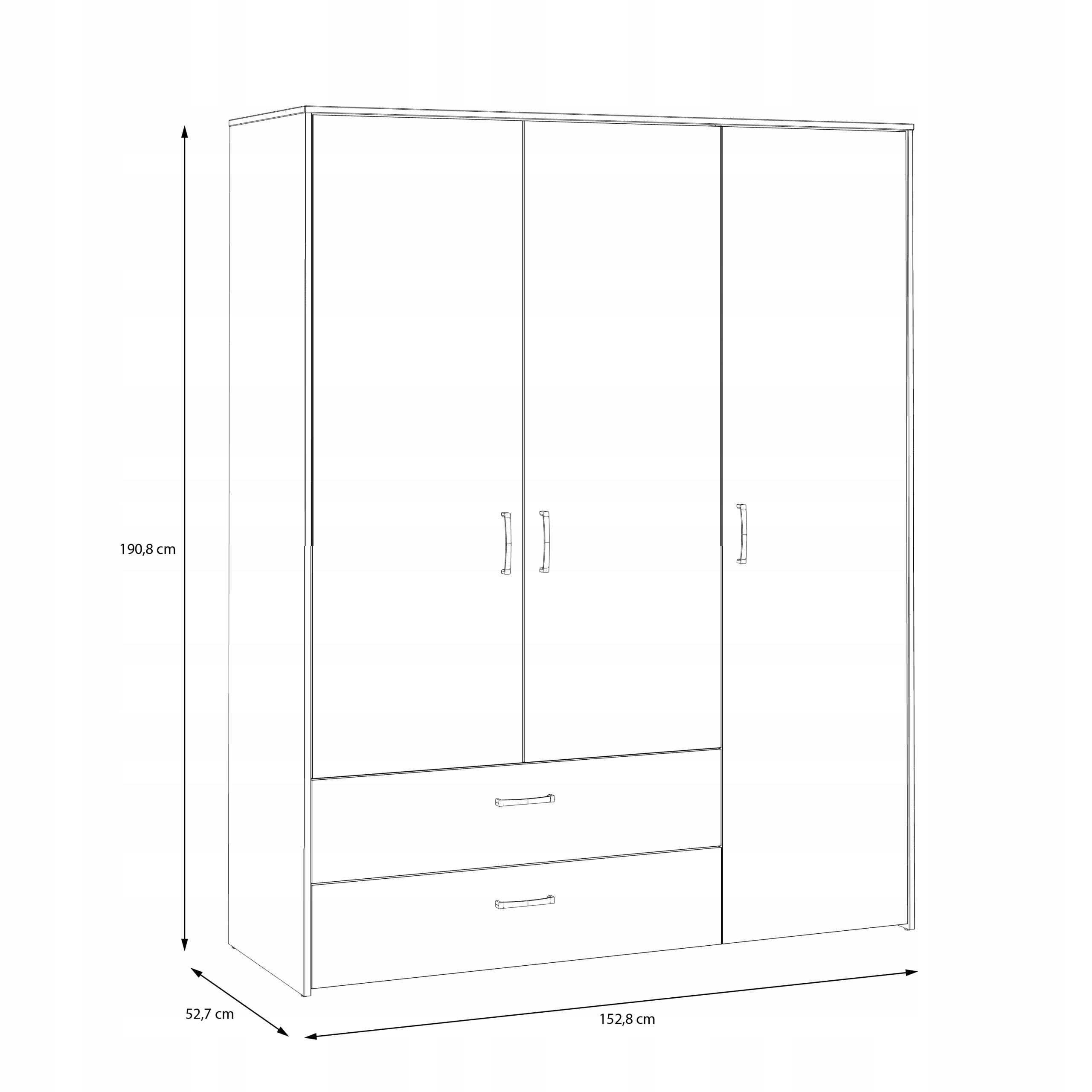 - Размеры шкафа: 153 см в ширину, 191 см в высоту, 53 см в глубину.