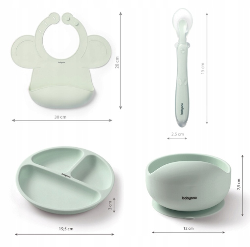 Набор блюд для детей, сделанных из мягкой силиконовой миски и тарелки с присожением, а также чайной ложкой и нагрудной мятой Babyono - идеально подходит для расширения диеты вашего ребенка! Стабильная тарелка и чаша всасывающая чашка, супер мягкий нагрудник с регулируемой застежкой и чайной ложкой гибкого пластика помогут вашему ребенку научиться есть