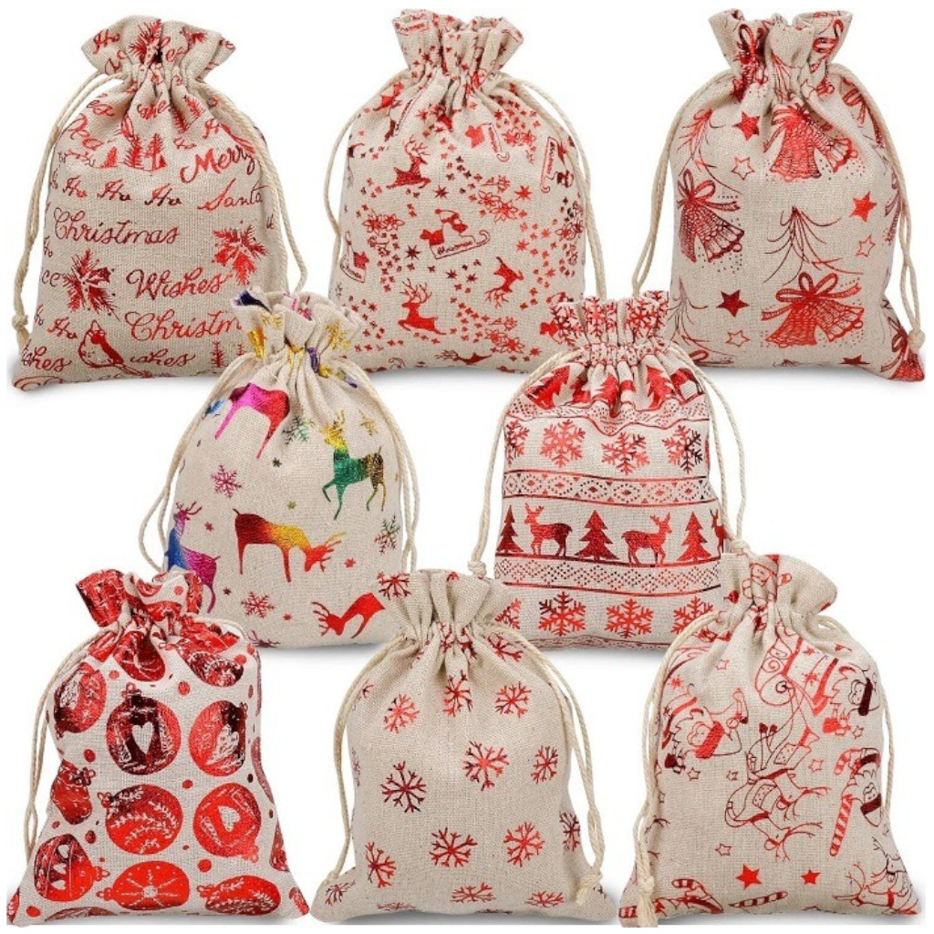 - 24 джутовых мешочка (12 разных рождественских узоров)