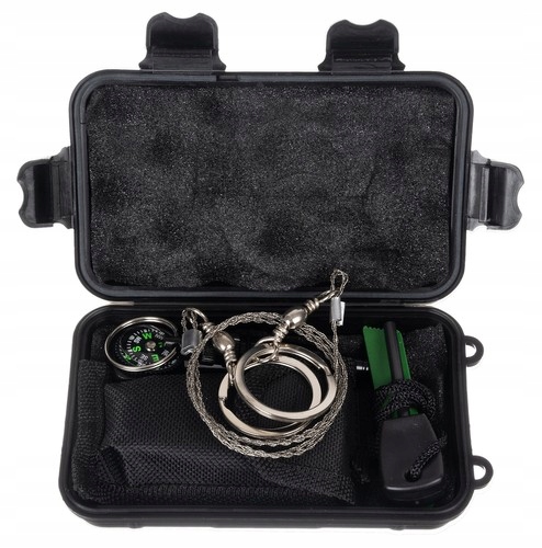 Разжигатель со стержнем на веревке — еще один элемент комплекта, позволяющий разжечь огонь, который может оказаться решающим в случае потери тепла или воды. Герметичный контейнер со свистком – идеальное решение для людей, которые хотят спрятать что-то маленькое и быть уверенным, что оно будет храниться в идеальных условиях.