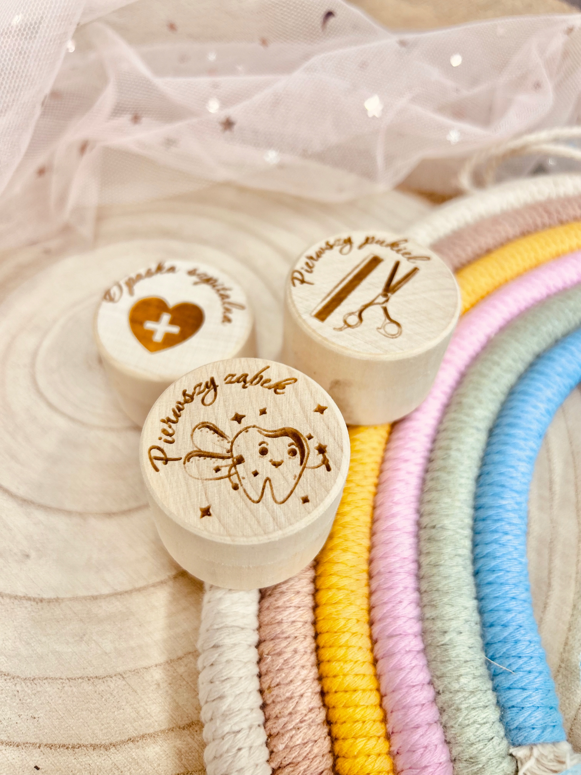 Сувенирный набор для ребенка, содержащий коробочки с гравировкой с надписями: «Первый зуб», «Больничный браслет» и «Первый замок». Это отличный способ сохранить память! Идеальное предложение для милого подарка на рождение, крещение или юбилей ребенка.
