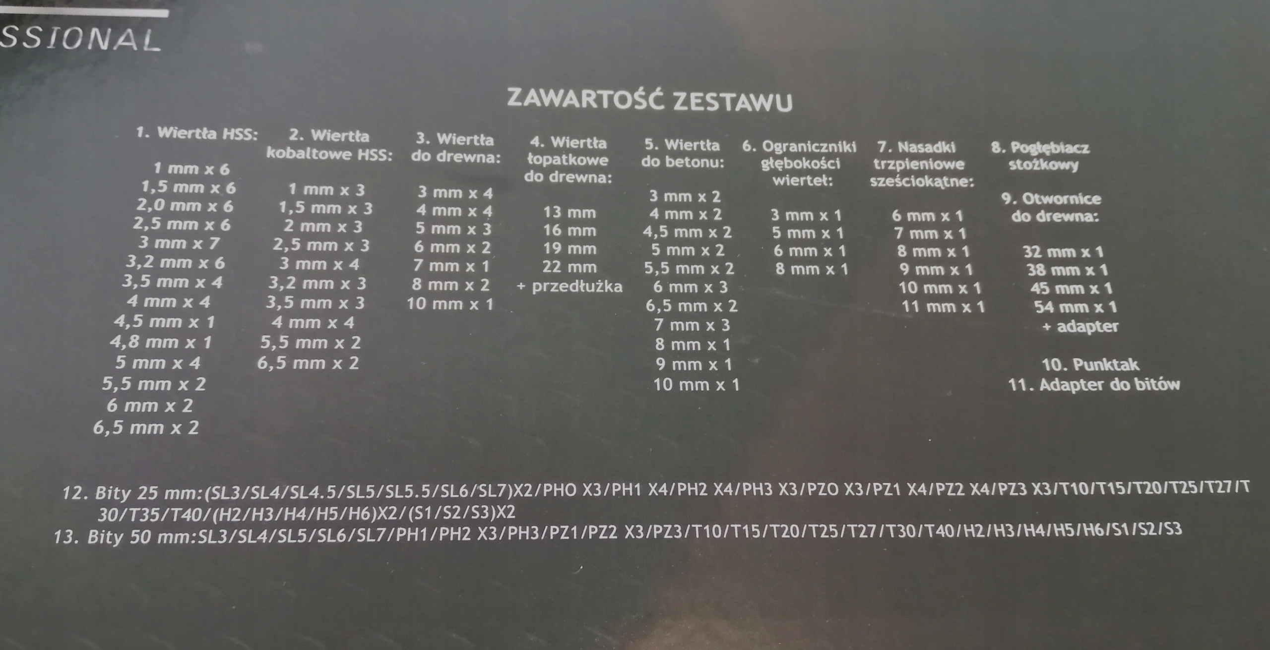 Набор аксессуаров, состоящих из всех элементов ручной работы 246, позволит вам выполнять различные работы. Набор включает в себя дрель, металлические сверла, бетонные сверла, кусочки, буровые отверстия, отверстия, кусочки, насадки Allen, конус глубоко, Allen Key, адаптеры. Все было помещено в твердый чемодан, благодаря тому, что хранение и транспорт такого большого набора не вызовут никаких проблем. Индивидуальные аксессуары назначаются определенным местом в чемодане, благодаря которому будет легко сохранить заказ