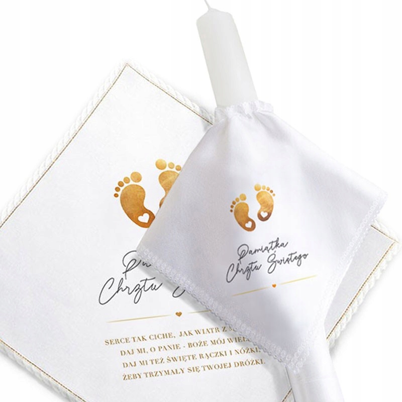- Состав: крестильная свеча, декорированная вручную белой атласной лентой во всю длину и лентой с отпечатком детских ножек, которую следует разместить на свече самостоятельно, и крестильное полотно в форме носовой платок, отделанный золотистым кружевом; печать на шарфе, выполненная методом сублимации.
