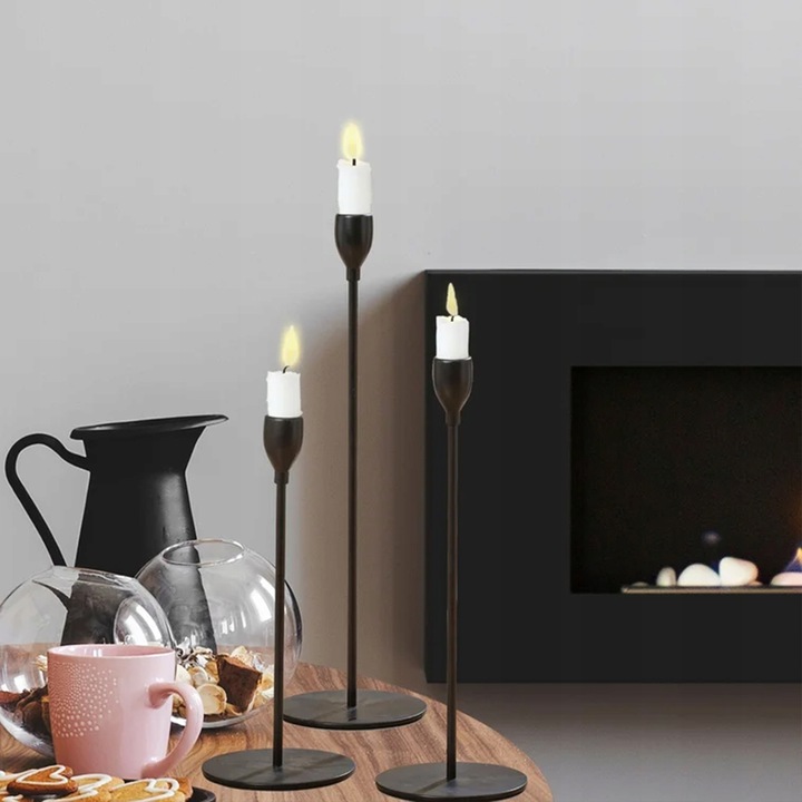 Набор из трех подсвечников из черного металла. Они прекрасно вписываются в современные тенденции дизайна интерьера и добавят интересный вид любому помещению. Они идеально подходят для ужина дома, а также для более крупных торжеств, таких как свадьбы, общественные мероприятия или специальные мероприятия.