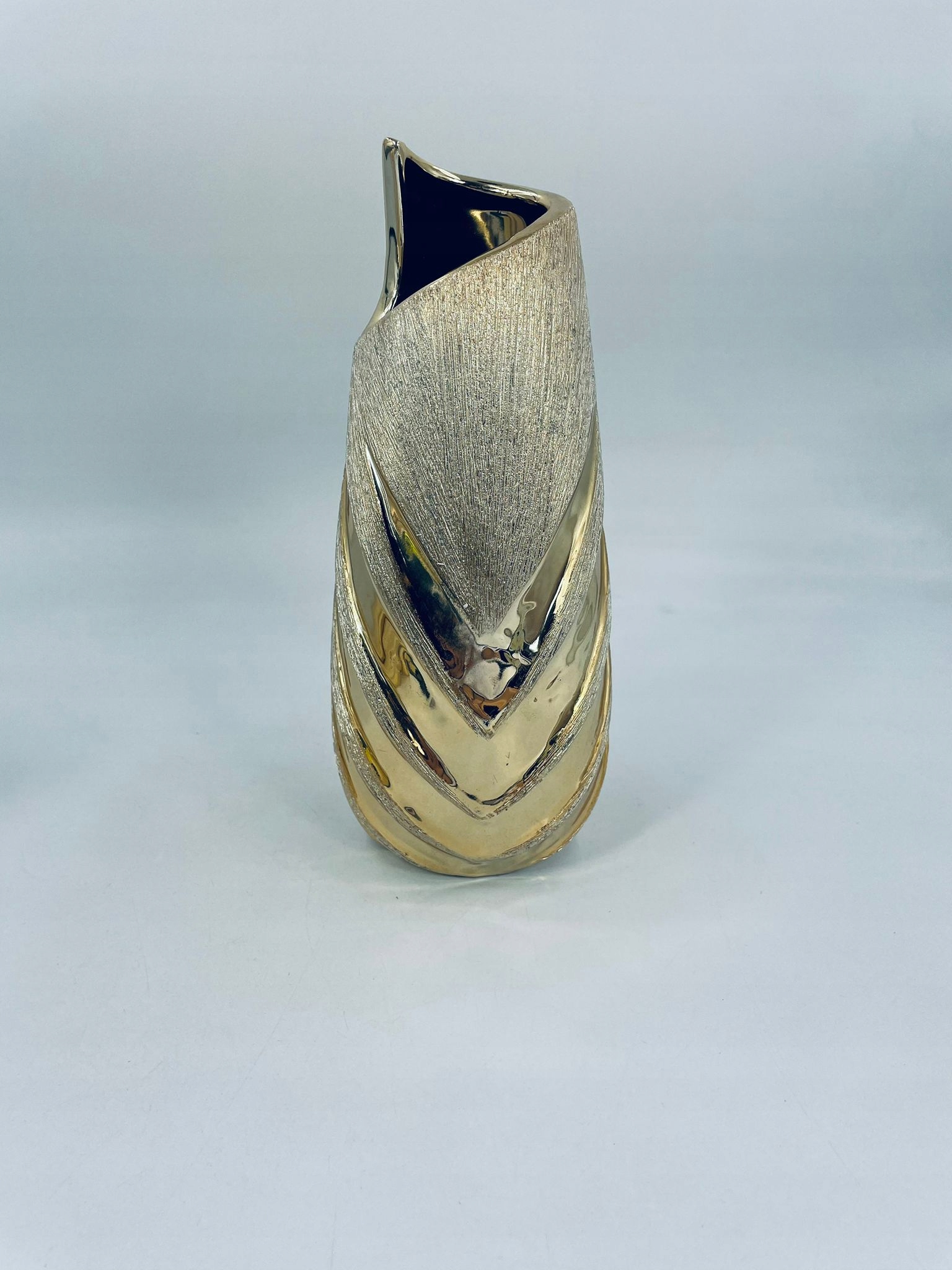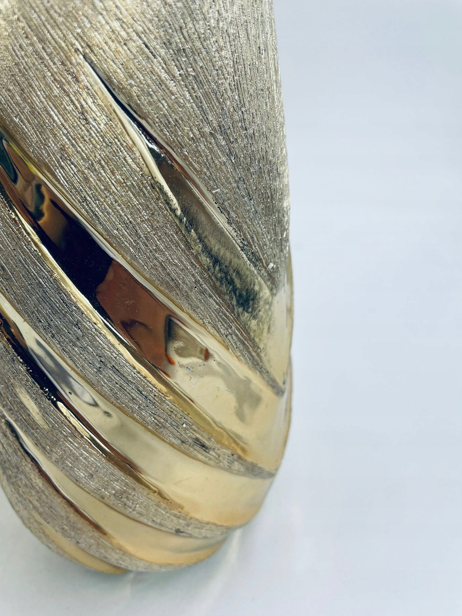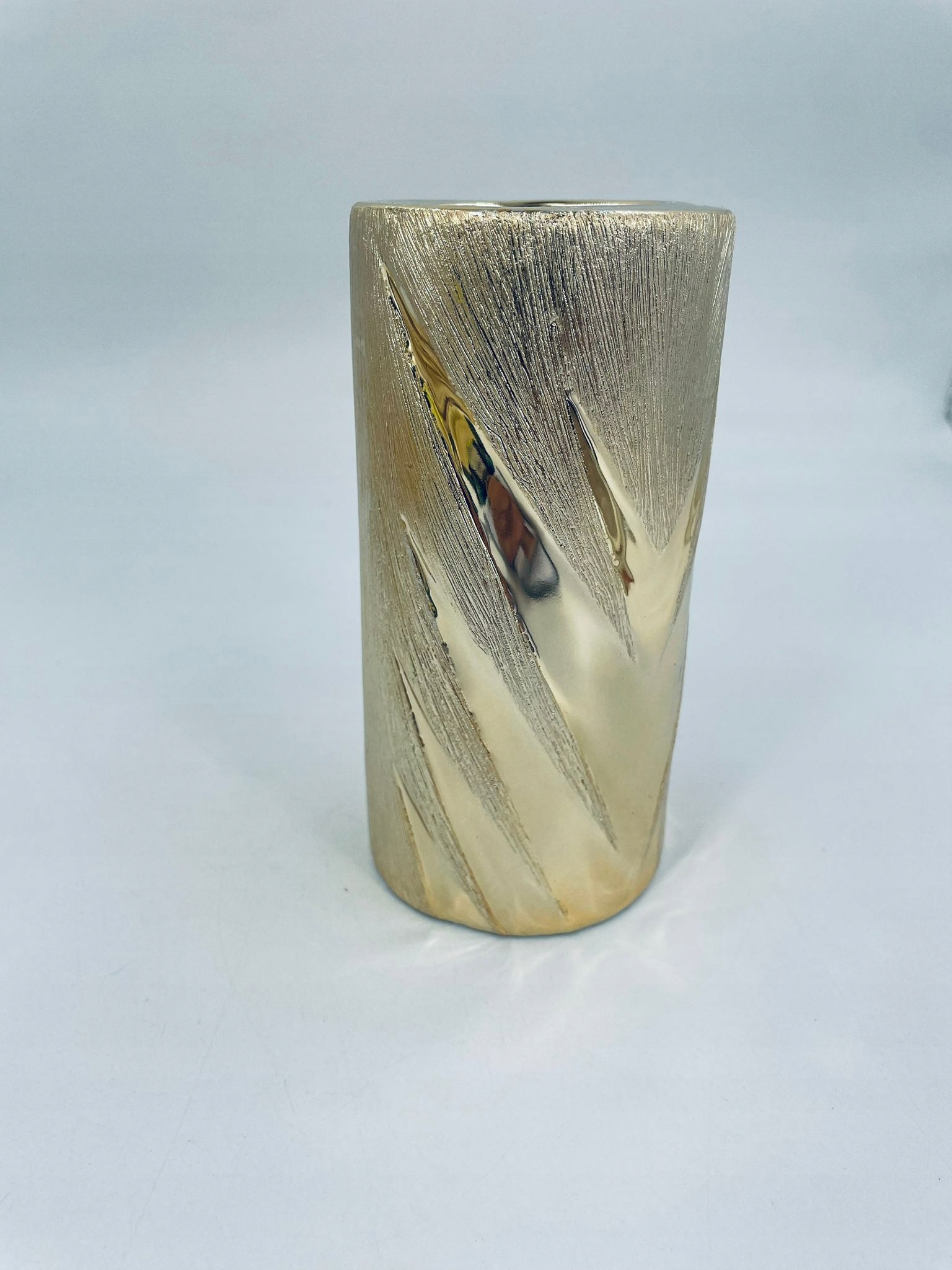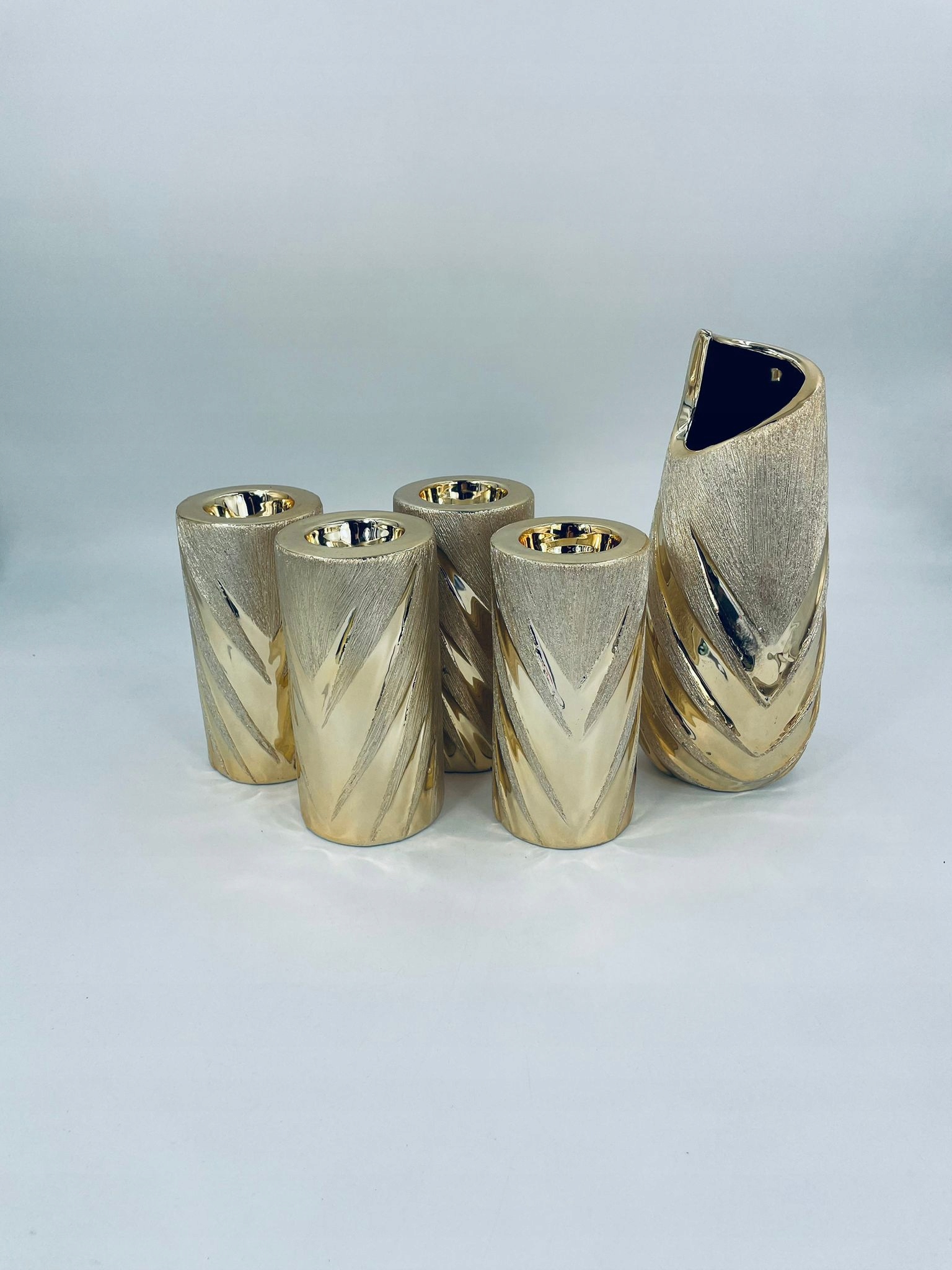 набор из четырех подсвечников и ваза, покрытая золотым текстурированным покрытием. Регуляторы и ваза характеризуются рельефными дизайнами, напоминающими Chevron. Декоративный набор идеально соответствует любому домашнему интерьеру. Валеры и ваза имеют ссадины и обесцвечивание.