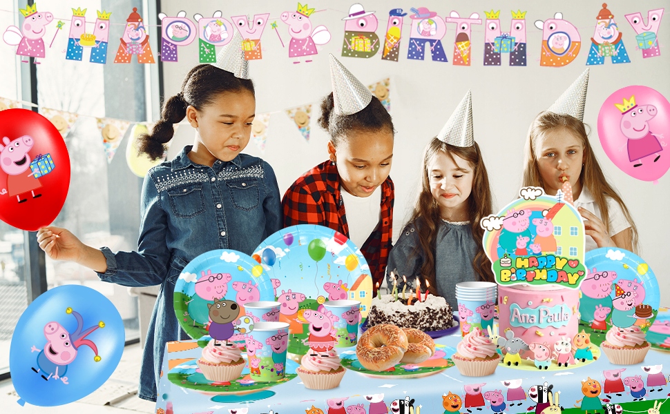 Шляпки для торта «Свинка Пеппа» из принадлежностей для вечеринки по случаю дня рождения «Свинка Пеппа» можно использовать для украшения праздничных десертов, а баннеры и воздушные шары на день рождения «Свинка Пеппа» можно разместить в привлекательных местах, чтобы добавить праздничной атмосферы вечеринке и создать особую вечеринку Габби для детей.