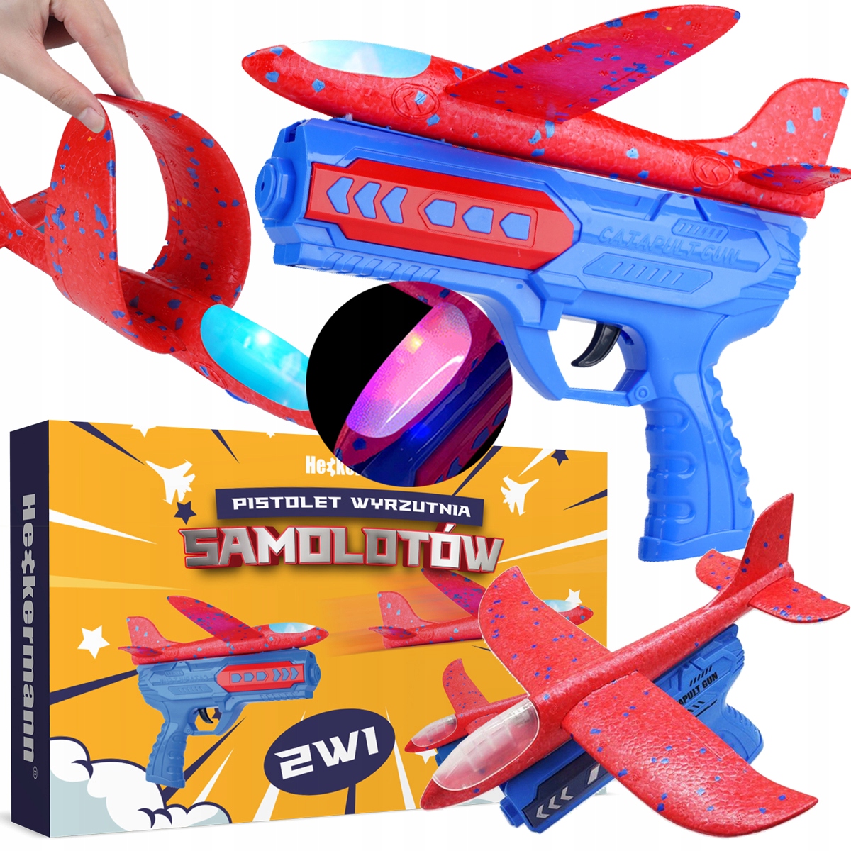 Пеноплан с пусковой установкой излучает красочное освещение, что дополнительно гарантирует потрясающие визуальные впечатления. Управлять игрушкой очень просто. Пистолет имеет противоскользящую рукоятку. Самолет также можно привести в движение вручную, без использования пушки.