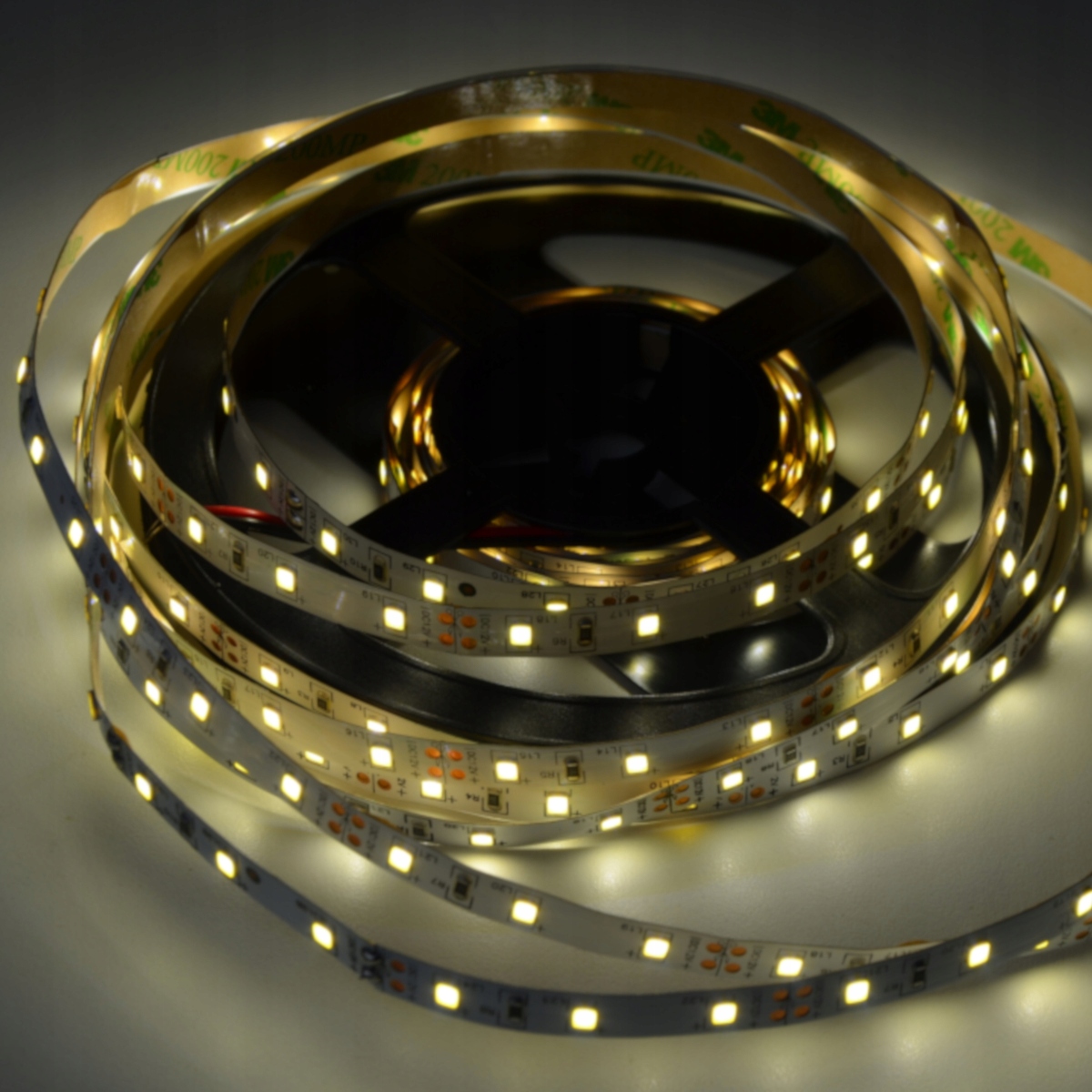 - 3 пятиметровых рулона светодиодной ленты 2835 12В постоянного тока 60 диодов/м, на белой основе, с нейтральным белым цветом света 4000-4500 К, номинальным максимальным потреблением тока 6 Вт/м, шириной светодиодной ленты 8 мм, лента заканчивается с одной стороны шнуром питания длиной около 10 см. Помните, что полосы постоянного тока 12 В должны быть запитаны с одной стороны максимум через каждые 5 м. Ленту можно укорачивать в отмеченных местах.