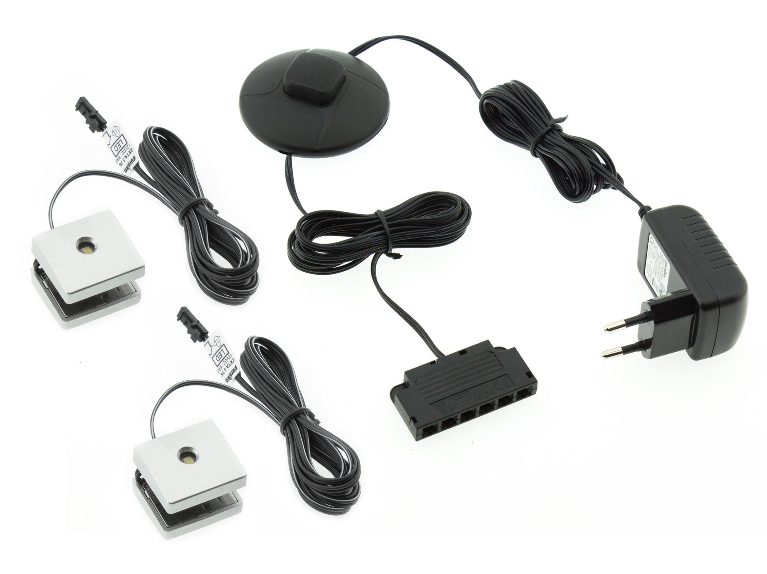 - 1 блок питания для светодиодов мощностью 2,4 Вт с 4-метровым кабелем, ножным переключателем и 6-точечным распределителем для подключения зажимов.