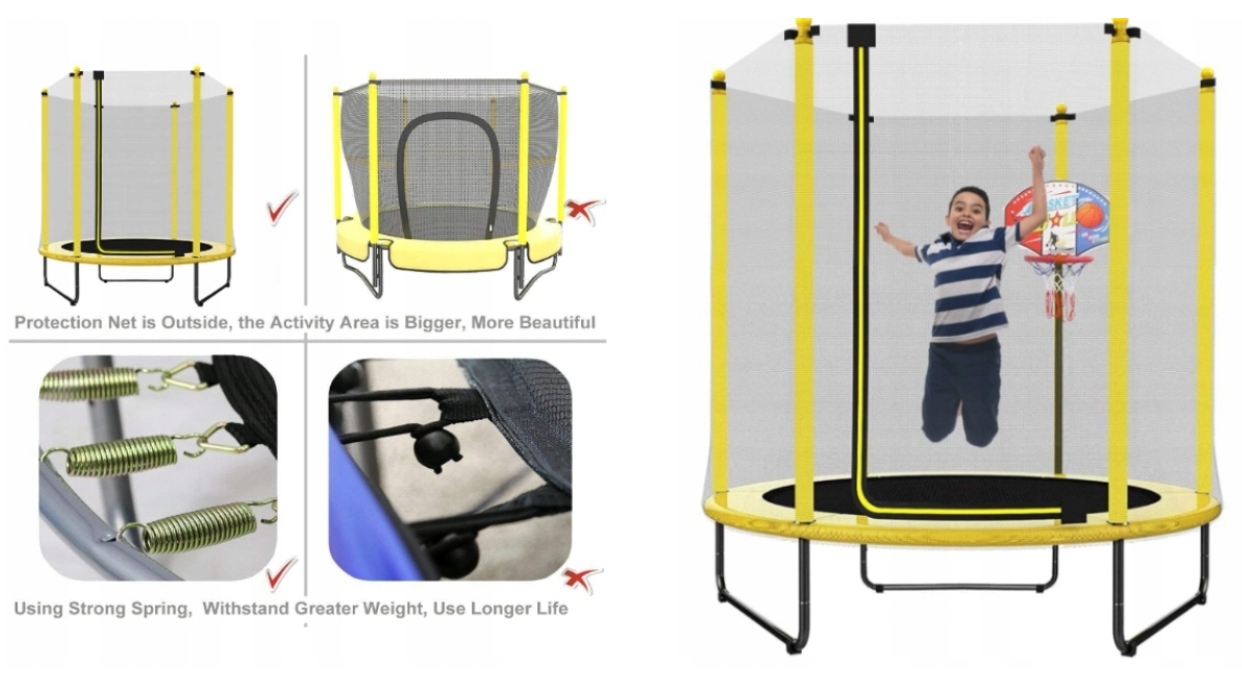 - Безопасная сетка строго и тесно связана с оцинкованными стальными стержнями с пенистыми манжетами. Между сетью и ковриком нет перерывов, благодаря которой гарантируется ваша безопасность во время прыжков. Полностью видимая сетка создает безопасную и приятную среду прыжка, потому что вы можете наблюдать за детьми за пределами окружающей сетки, а целая среда за пределами батута