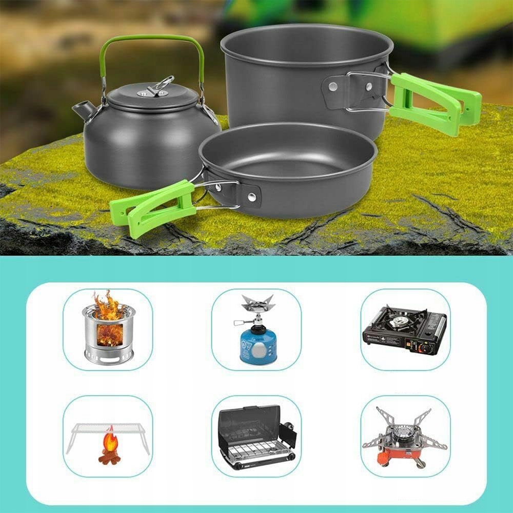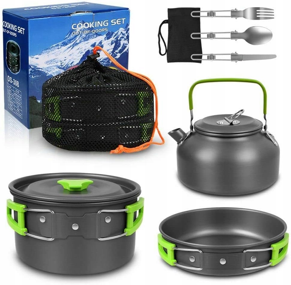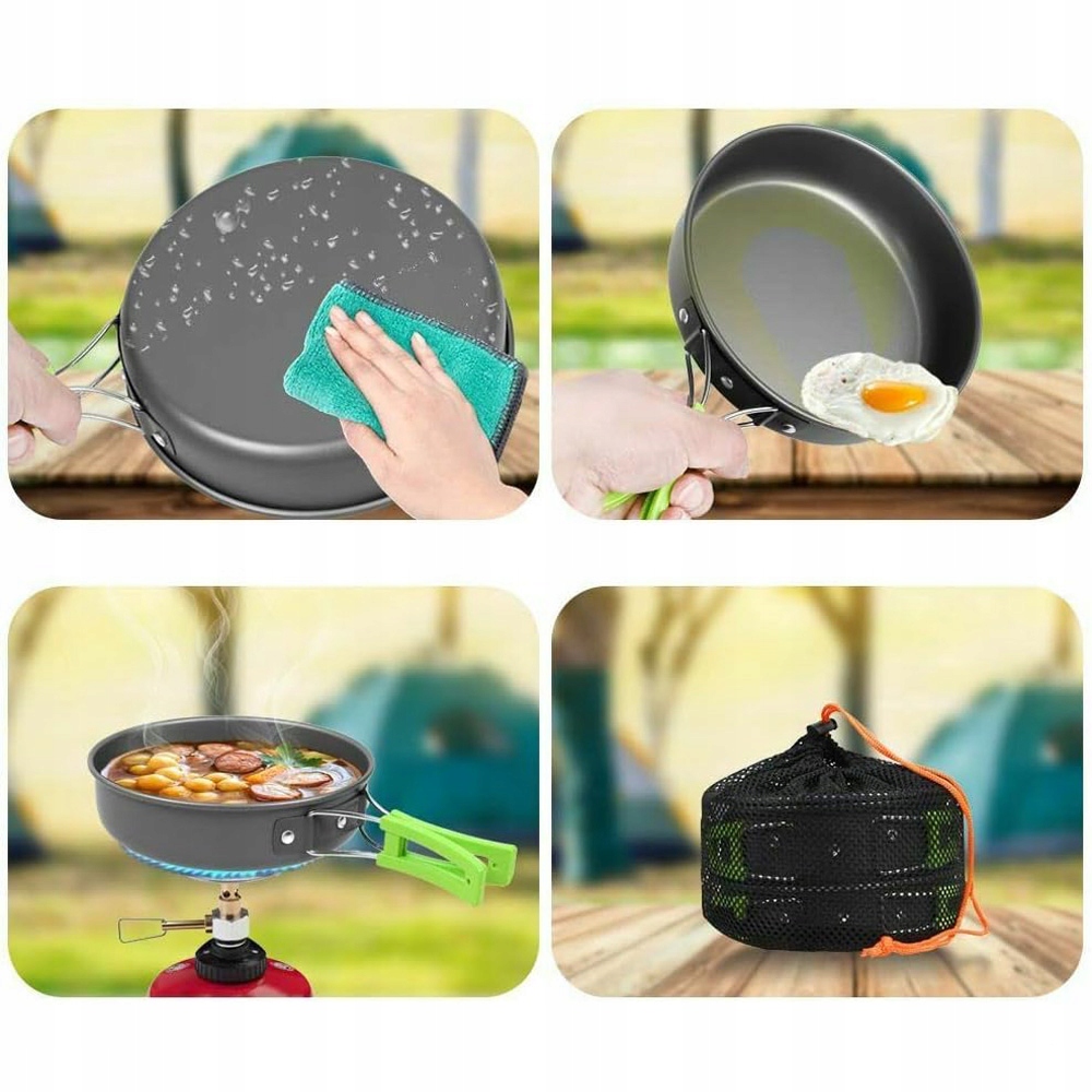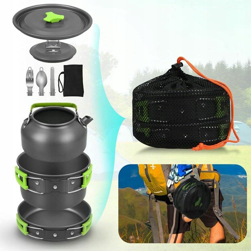 ⛺- изготовлен из высококачественного материала, устойчивого к царапинам, потреблению и долговечному, так что вы можете использовать его в течение длительного времени. Он содержит горшок для приготовления пищи, чайник, кастрюлю, 2 ножа, 2 вилки, 2 столовые ложки, 2 крючка, 2 складных чашки, мешок для хранения, сетчатая сумка.