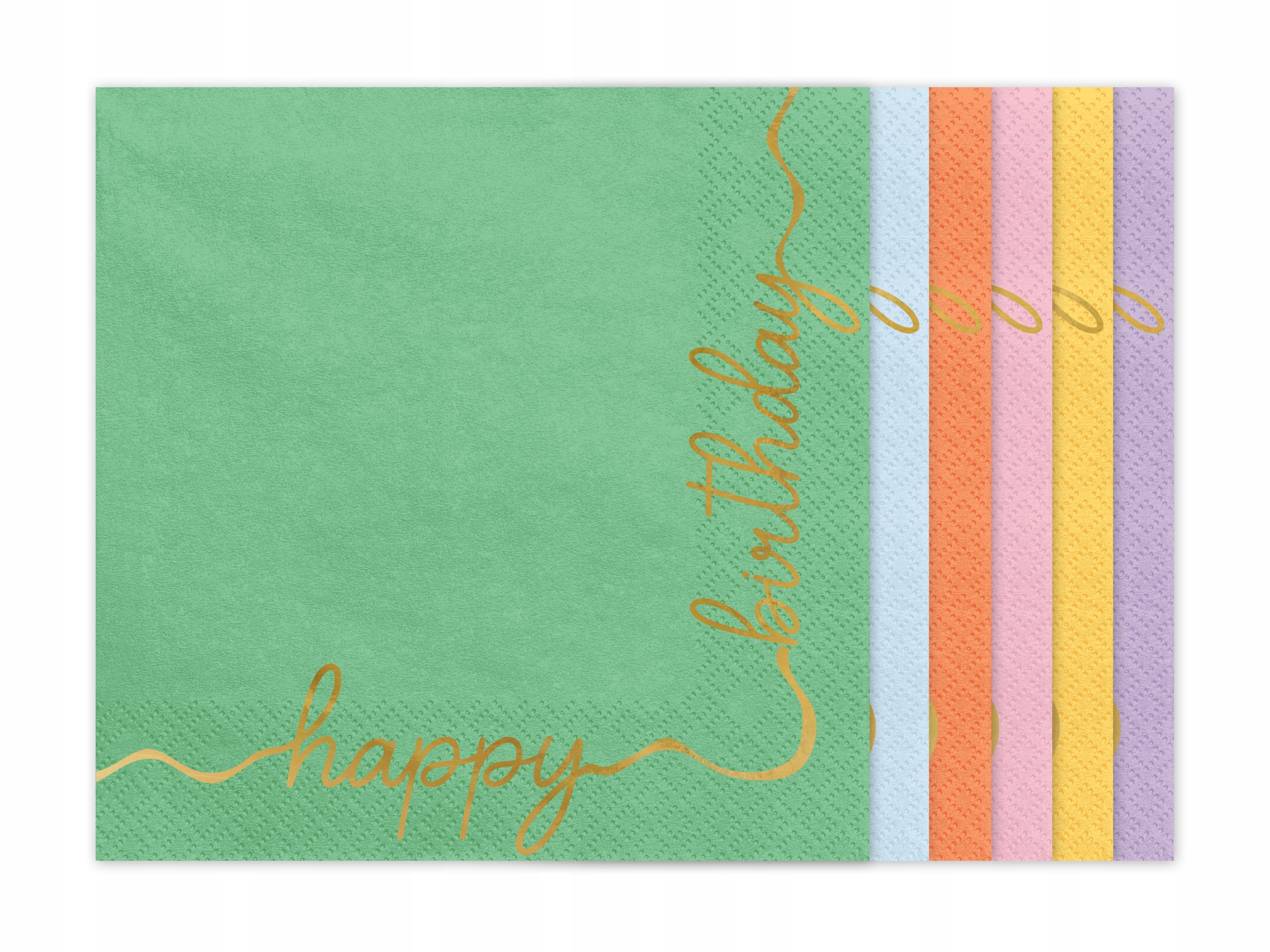 ✅12 бумажные салфетки с размерами 33x33 см после развертывания, также в пастельных тонах, украшенные элегантной, золотой надписью «С днем рождения».