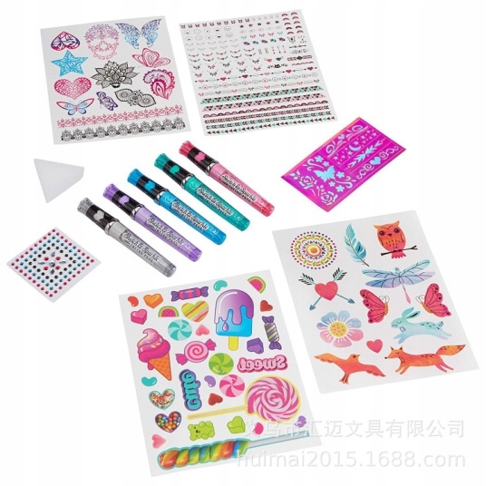 В КОМПЛЕКТ ВХОДЯТ 57 татуировок, 108 татуировок из фольги, 85 татуировок с драгоценными камнями, 6 наклеек-трафаретов, 5 ручек для эскизов и татуировок с блестками, губку.