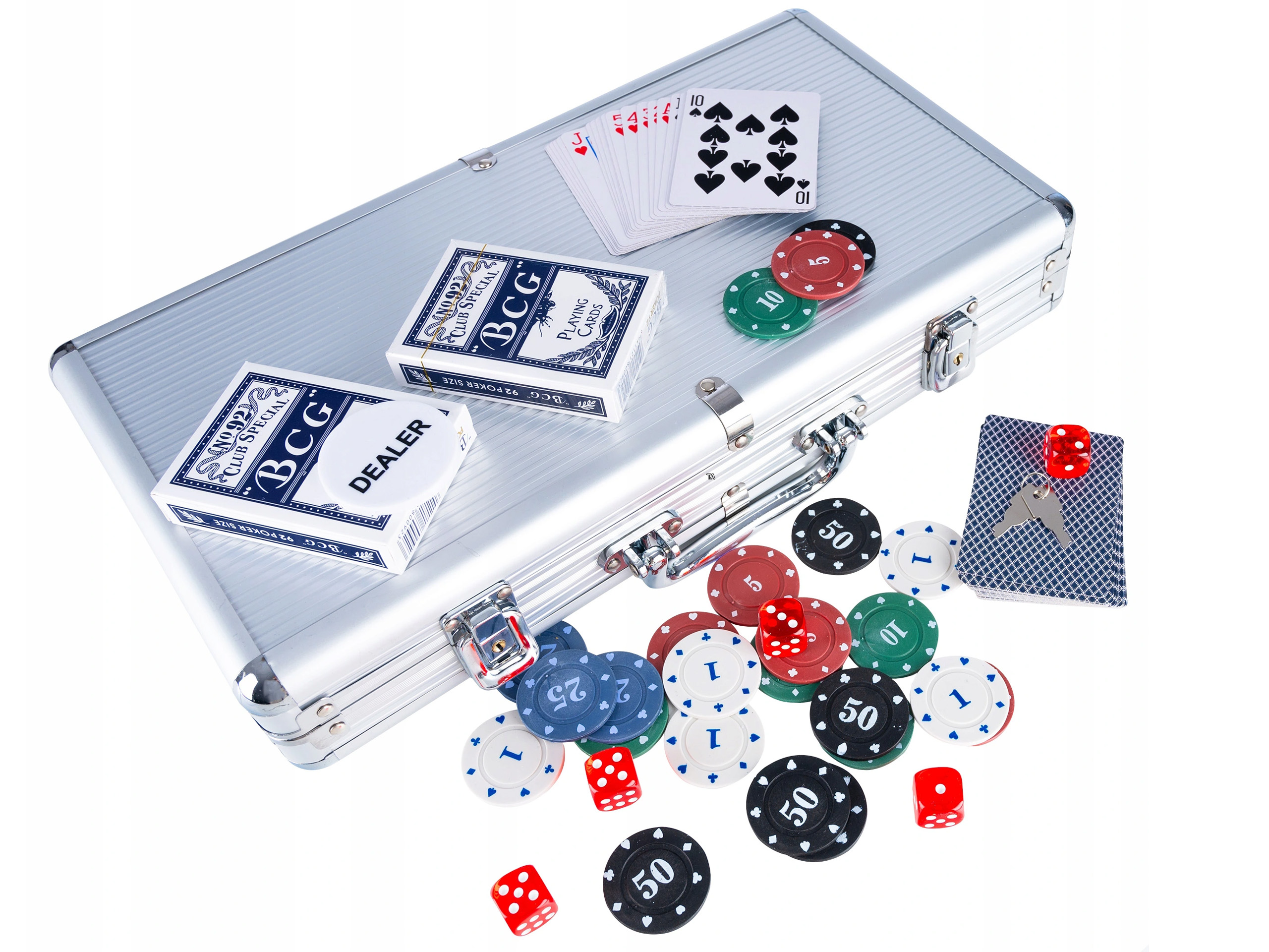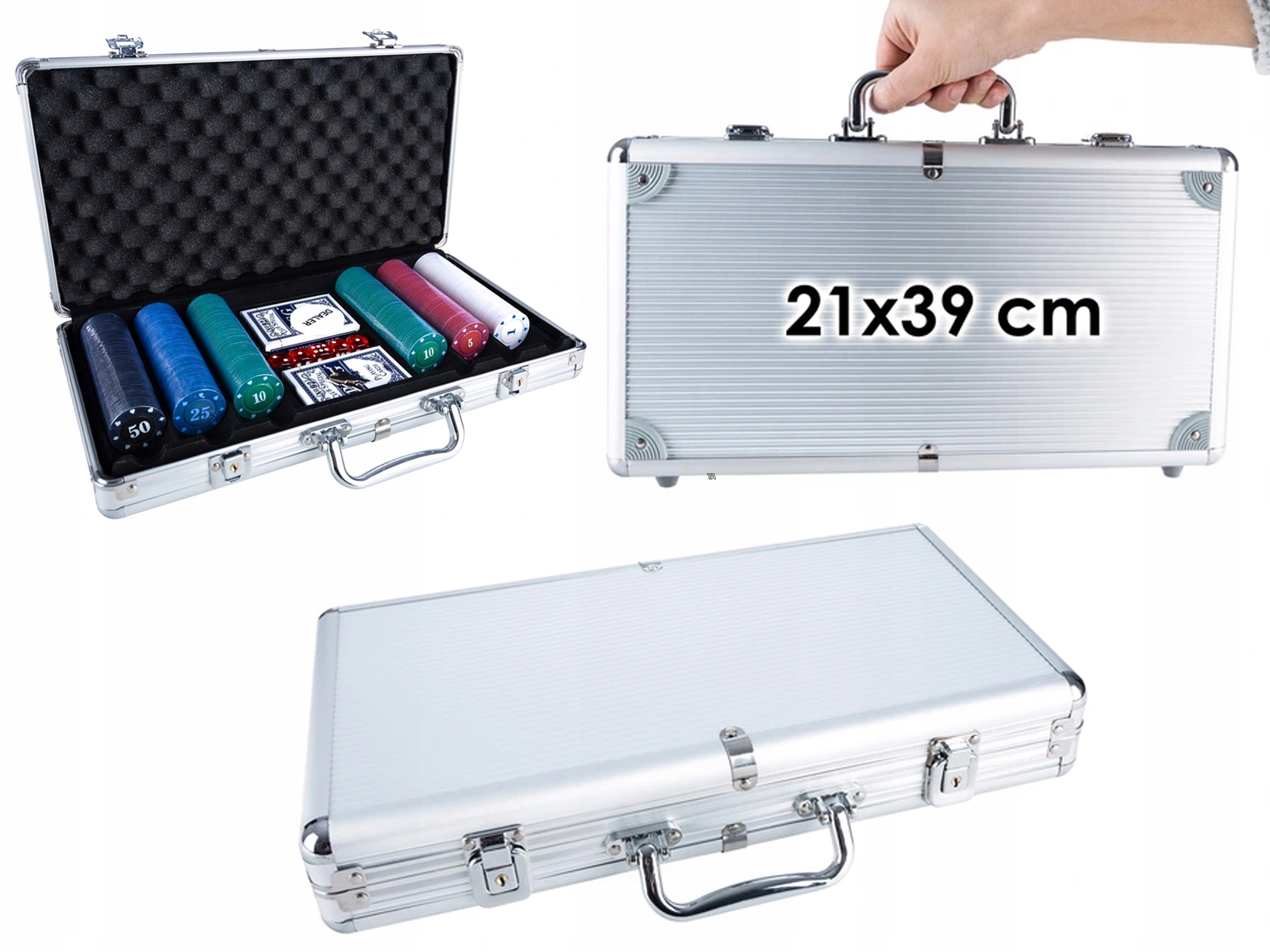 Профессиональный, добротный набор для покера или игральных костей. В комплекте две колоды карт, набор игральных костей и 300 игровых жетонов, упакованные в элегантный чемодан. Содержит все элементы, необходимые для игры в покер, кости или блэкджек: две колоды карт, набор игральных костей, жетон дилера - ДИЛЕР.