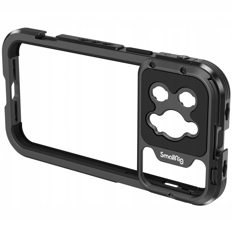 SmallRig Мобильный видеокомплект для одного портативного устройства для видеоблогов для iPhone 14 Pro Max представляет собой комбинацию идеально подходящего каркаса для камеры и боковой ручки, которая позволяет делать точные и плавные снимки. Клетка имеет дополнительные точки крепления для аксессуаров и использует систему быстрого крепления.