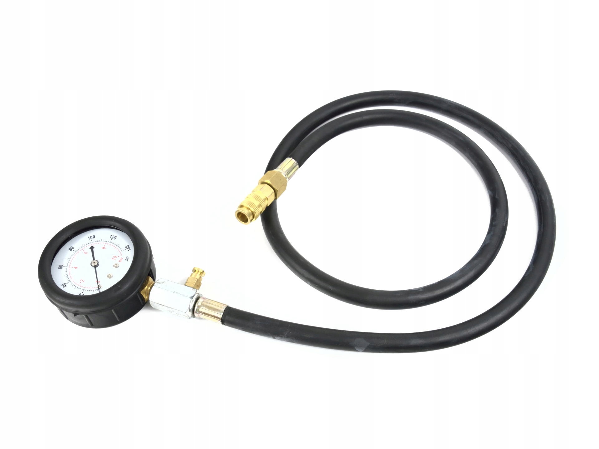 Набор из множества переходников позволит подобрать соответствующий совет. Манометр имеет резиновую крышку, защищающую его от повреждений при падении. Тестер оснащен длинным гибким шлангом.
