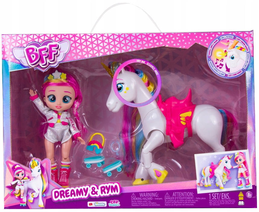 Благодаря мечтательной кукле BFF и ее рифме единорога, веселье может быть еще более приятным. Уголок рифмы светит и издает звуки, когда вы нажимаете на его голову. Это волшебный момент, и переживание его снова очень весело, тем более что Rhyme может издавать шесть разных звуков. Мечтательная и рифма могут делать забавные позы. Dreamy имеет длинные, красочные, блестящие волосы и стеклянные глаза, а ее наряд напоминает фигурные наряды. Набор также включает в себя колеса, благодаря тому, что мечтательные могут притворяться кататься на коньках, а также седло, так что мечтательный также может ездить на задней части Ryma. Испытайте уникальные приключения с мечтательными и Раймем!