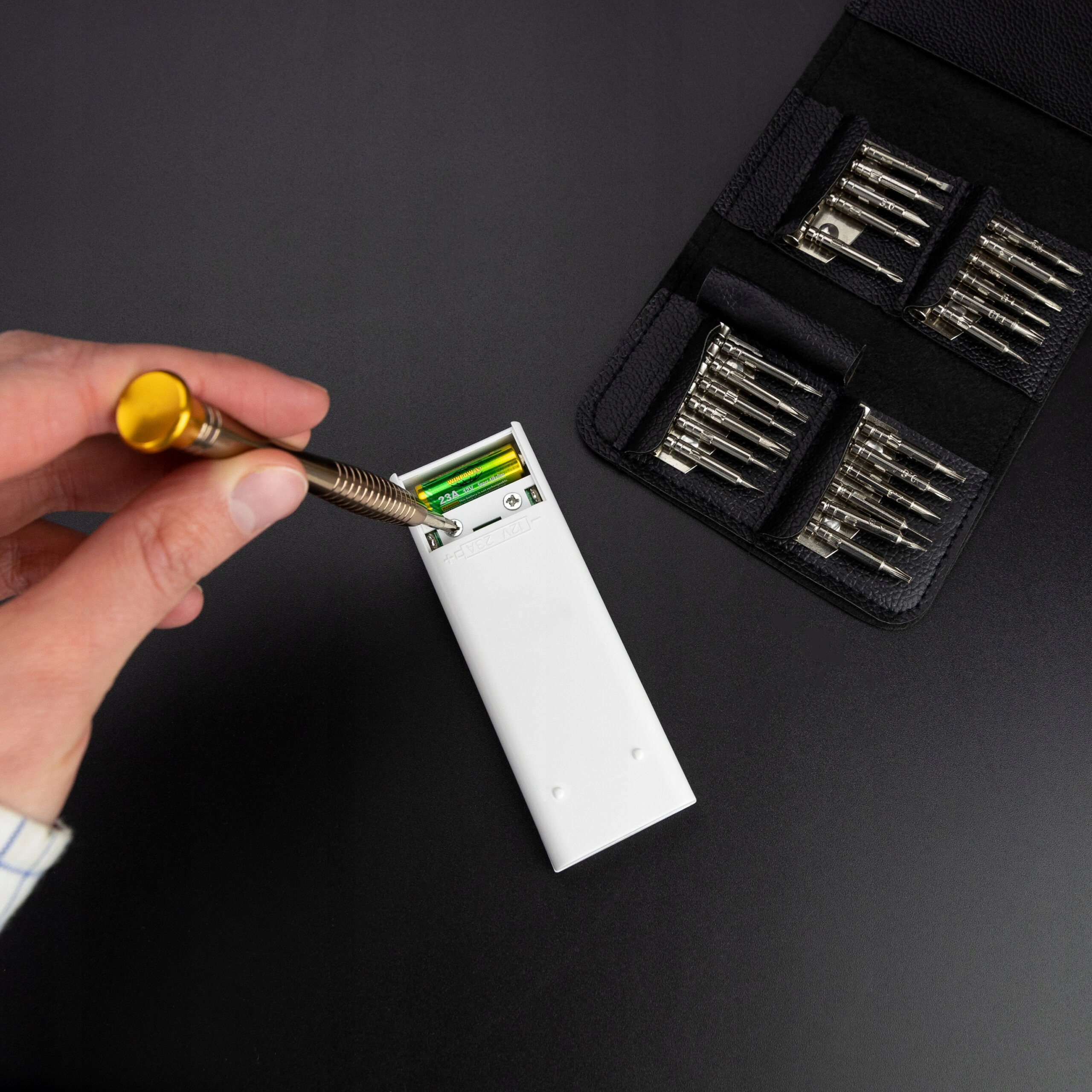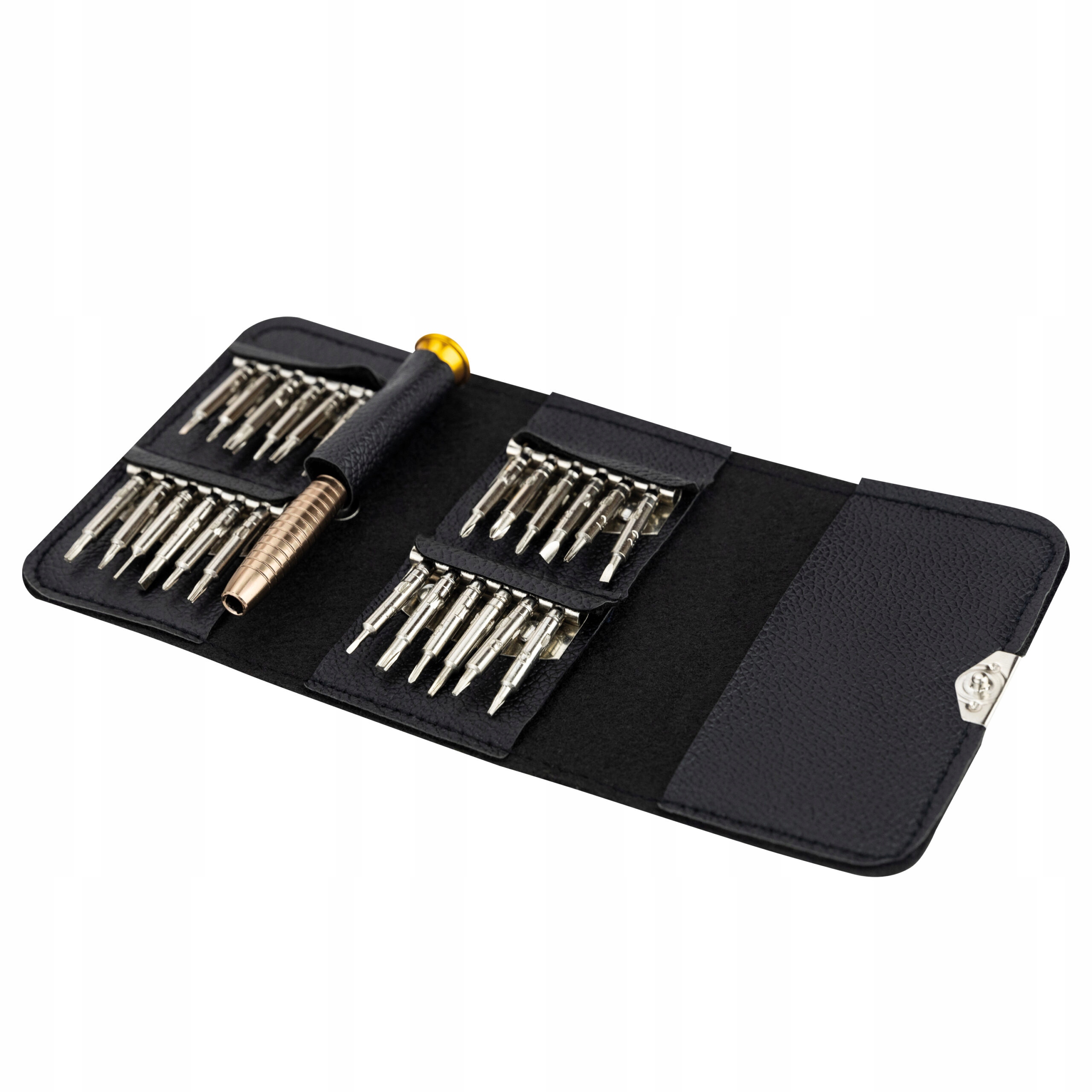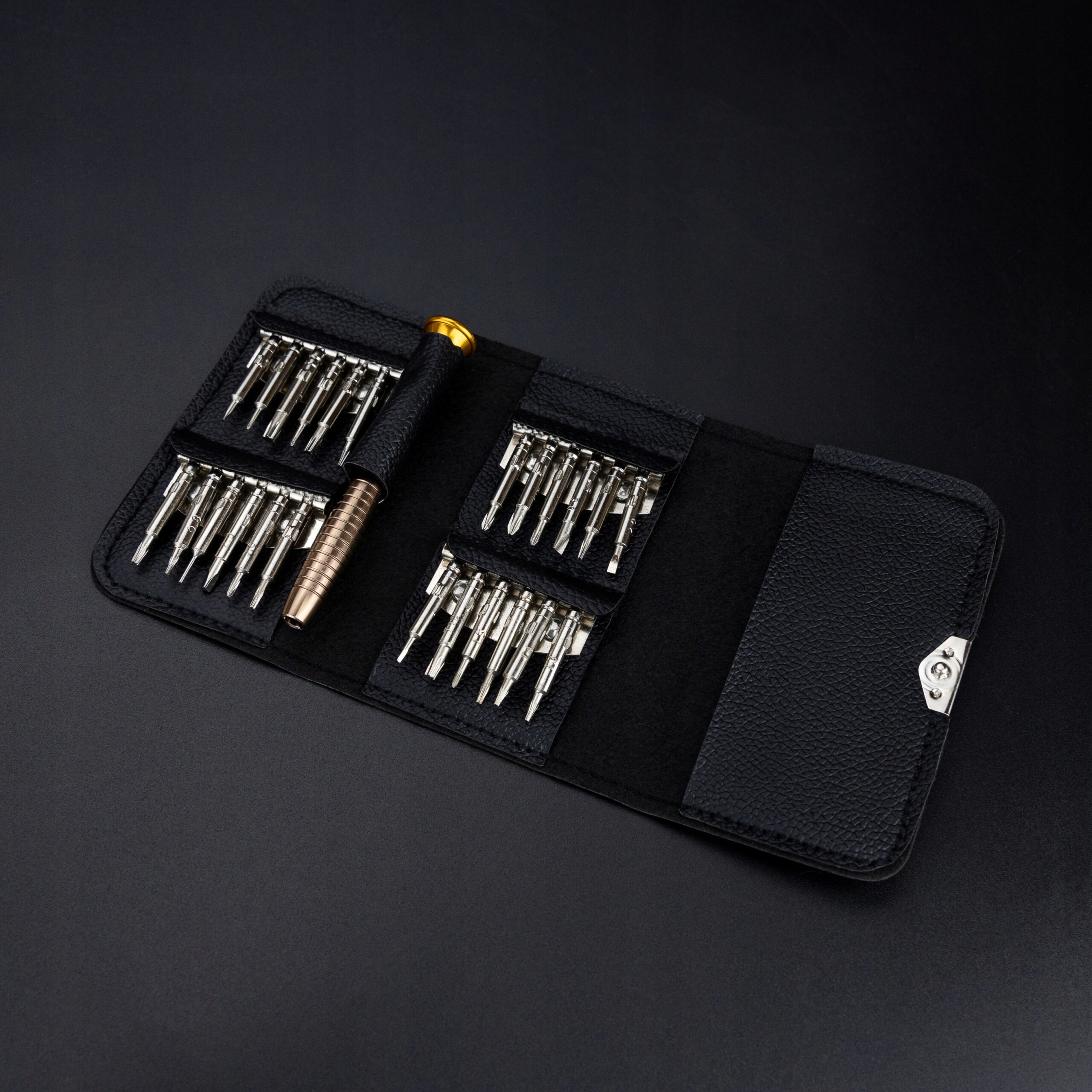 На нашем аукционе представлен набор прецизионных отверток. В наборе 24 бит разного размера, что позволяет подогнать их под конкретное занятие и предмет, а также магнитный алюминиевый держатель. Все это упаковано в элегантный карманный футляр, закрывающийся зажимом.