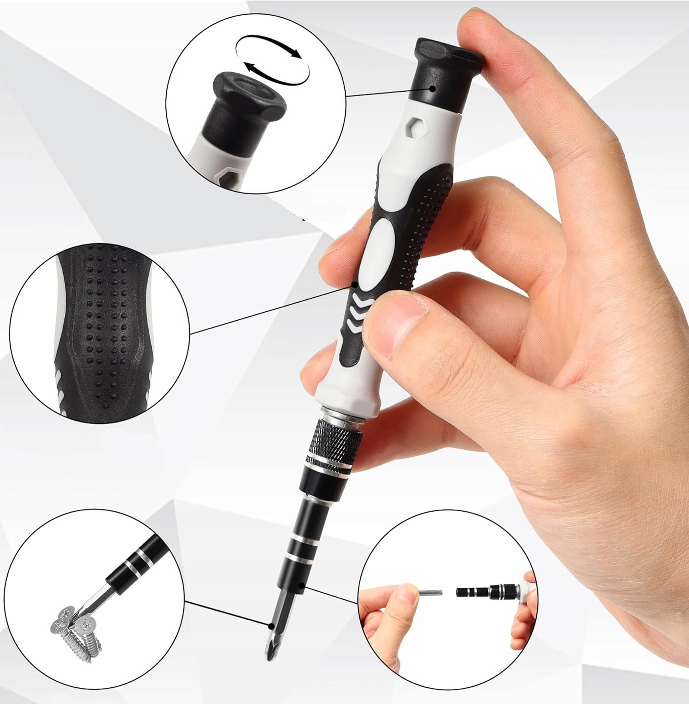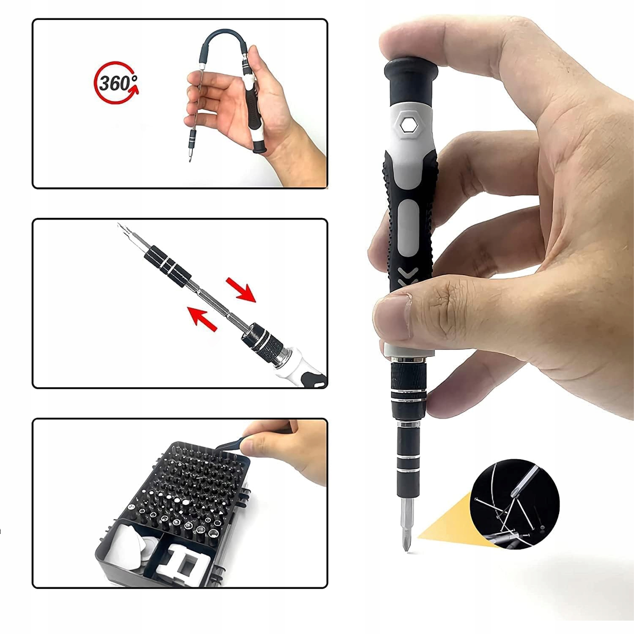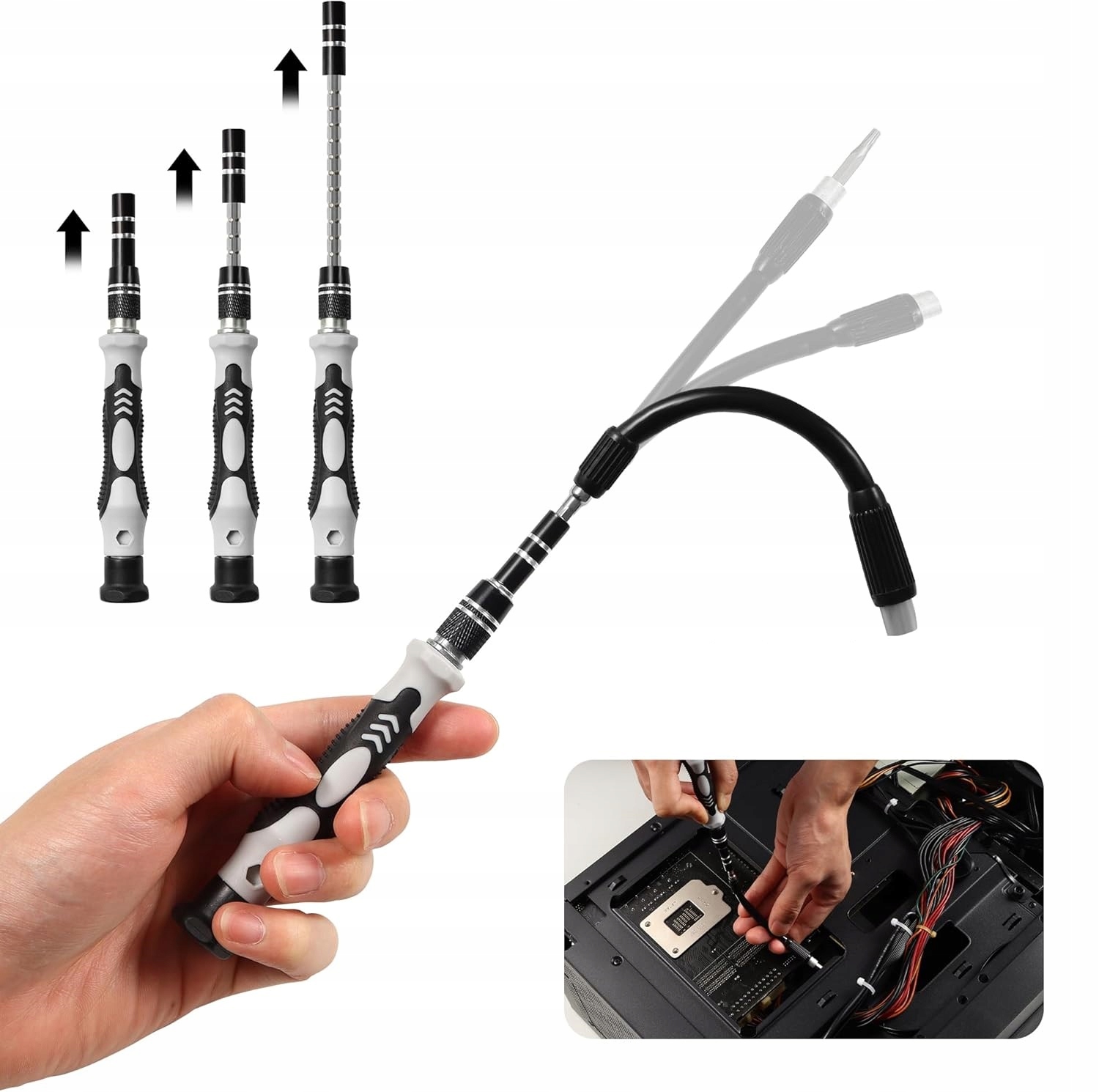 Гибкий удлинитель может быть повернут на 360 ° , что позволяет вам добраться до каждого даже самого сложного места, Точные пинцеты помогают собирать небольшие крепежные элементы, всасывающие чашки и штифт для удаления SIM -карт идеально подходят для телефона и таблетов.