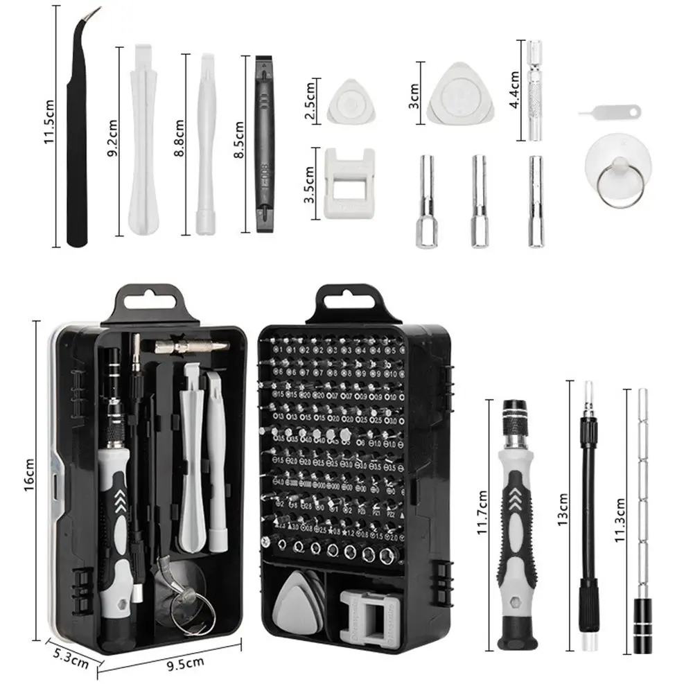 - Комплексность: В наборе есть все необходимое для точного ремонта – от разнообразных пластиковых открывашек до магнитных насадок от отверток. 103 различных магнитных насадки с длинными шейками обеспечивают универсальность использования.