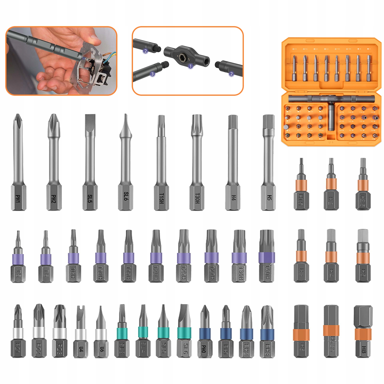42 многофункциональных насадки для отверток: набор прецизионных инструментов с магнитной трещоткой включает 40 насадок из хромомолибденовой стали S2 и идеально подходит для использования дома, на работе и для проектов DIY. В комплект входят 32 короткие насадки (каждая по 25 мм) и 8 длинных насадок (каждая по 45 мм), включая PH (4), SL (4), Torx (10), Allen (9), PZ (3), U (2) и многие другие. Благодаря этому набору отверток с храповым механизмом у вас всегда под рукой будет нужный инструмент для выполнения большинства повседневных точных ремонтов.